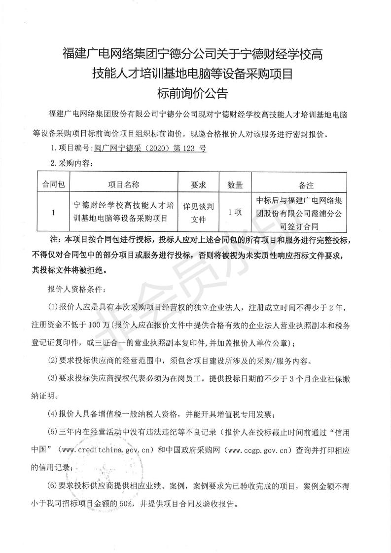 宁德财经学校高技能人才培训基地电脑等设备采购项目标前询价公告