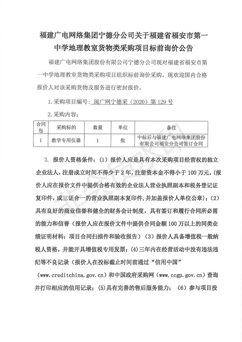 福安市第一中学地理教室货物类采购项目标前询价公告