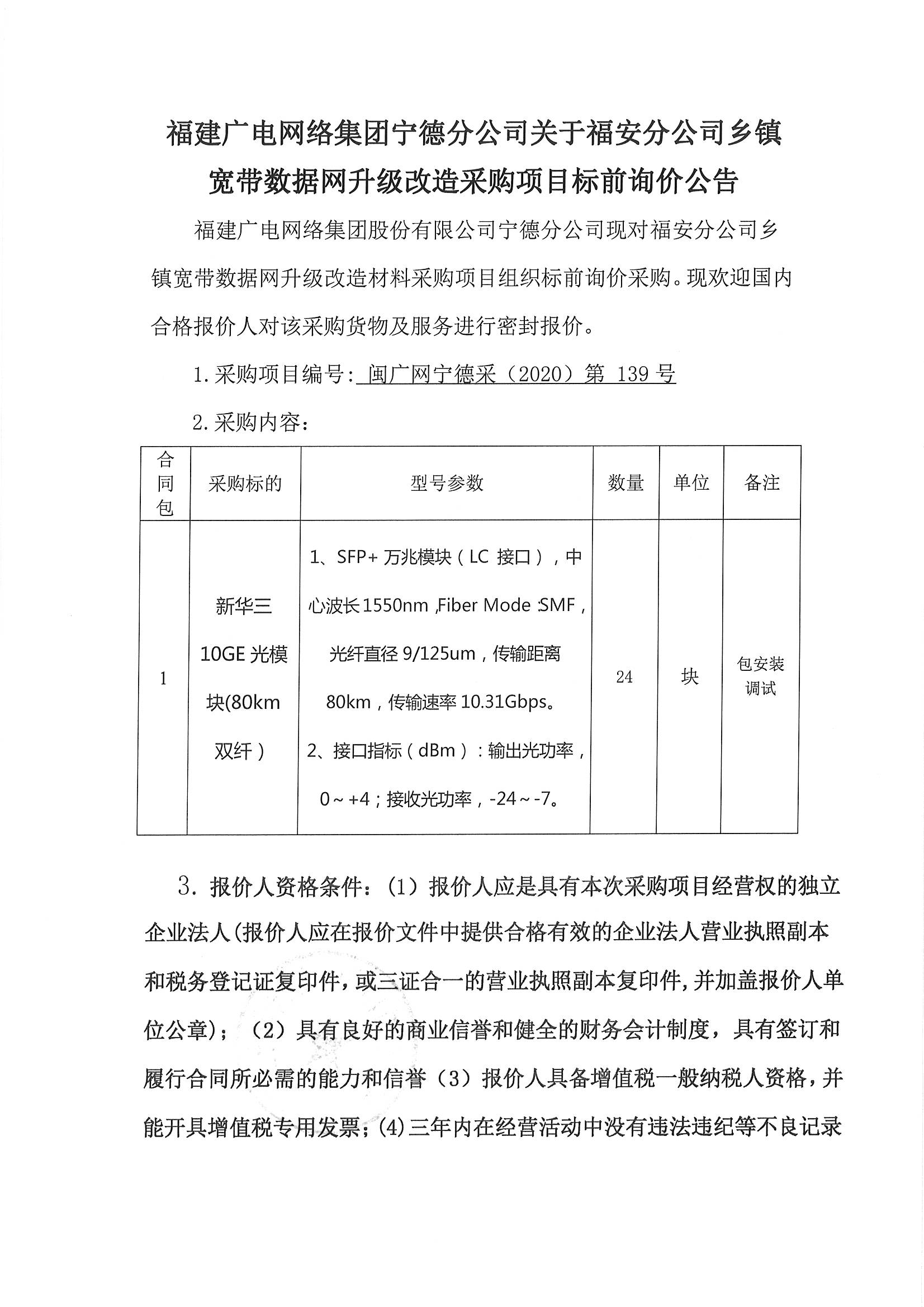 福安分公司乡镇宽带数据网升级改造采购项目标前询价公告