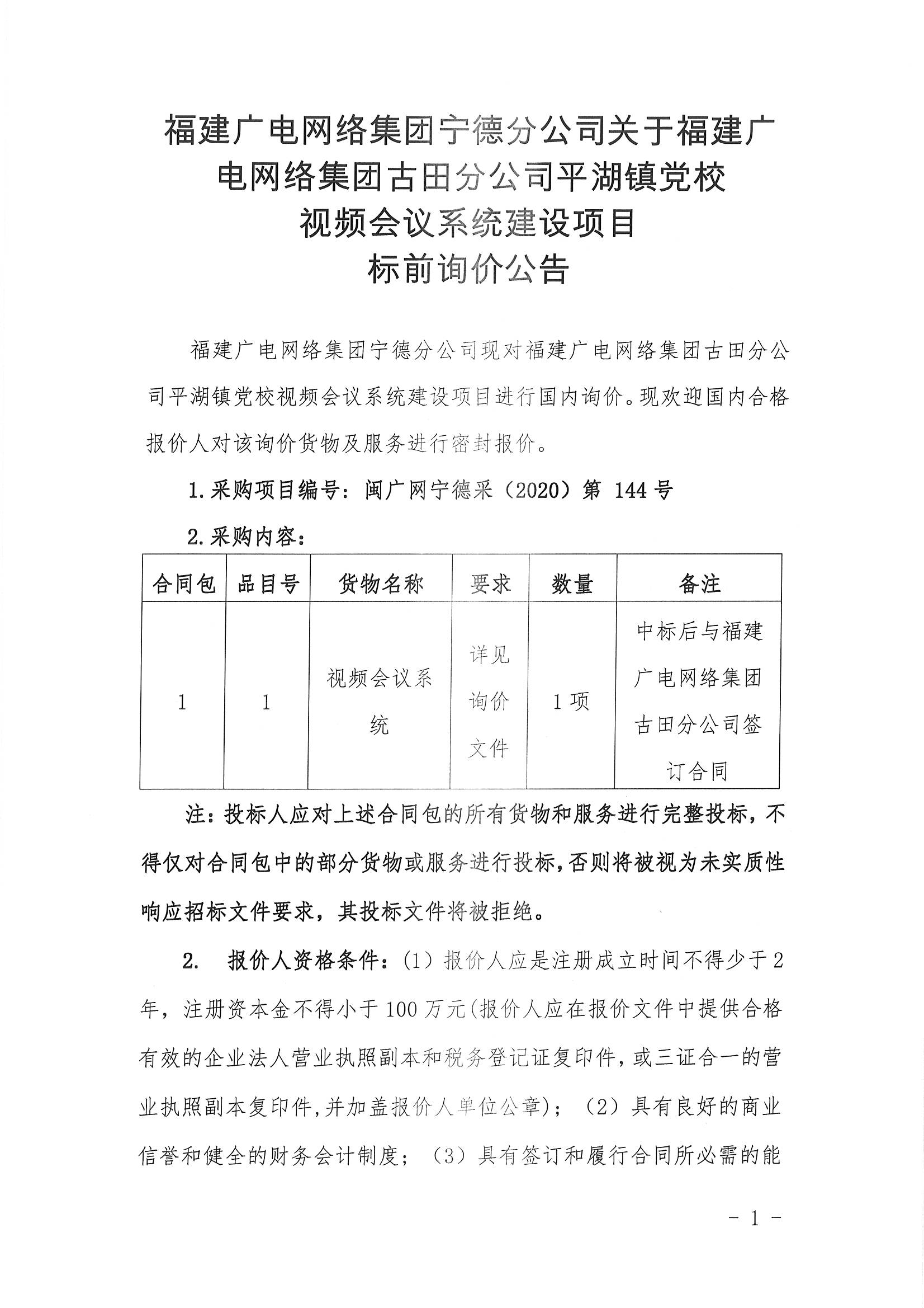 古田分公司平湖镇党校视频会议系统建设项目标前询价公告