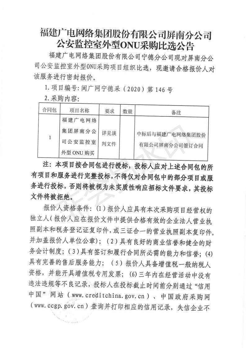 屏南分公司公安监控室外型ONU采购比选公告