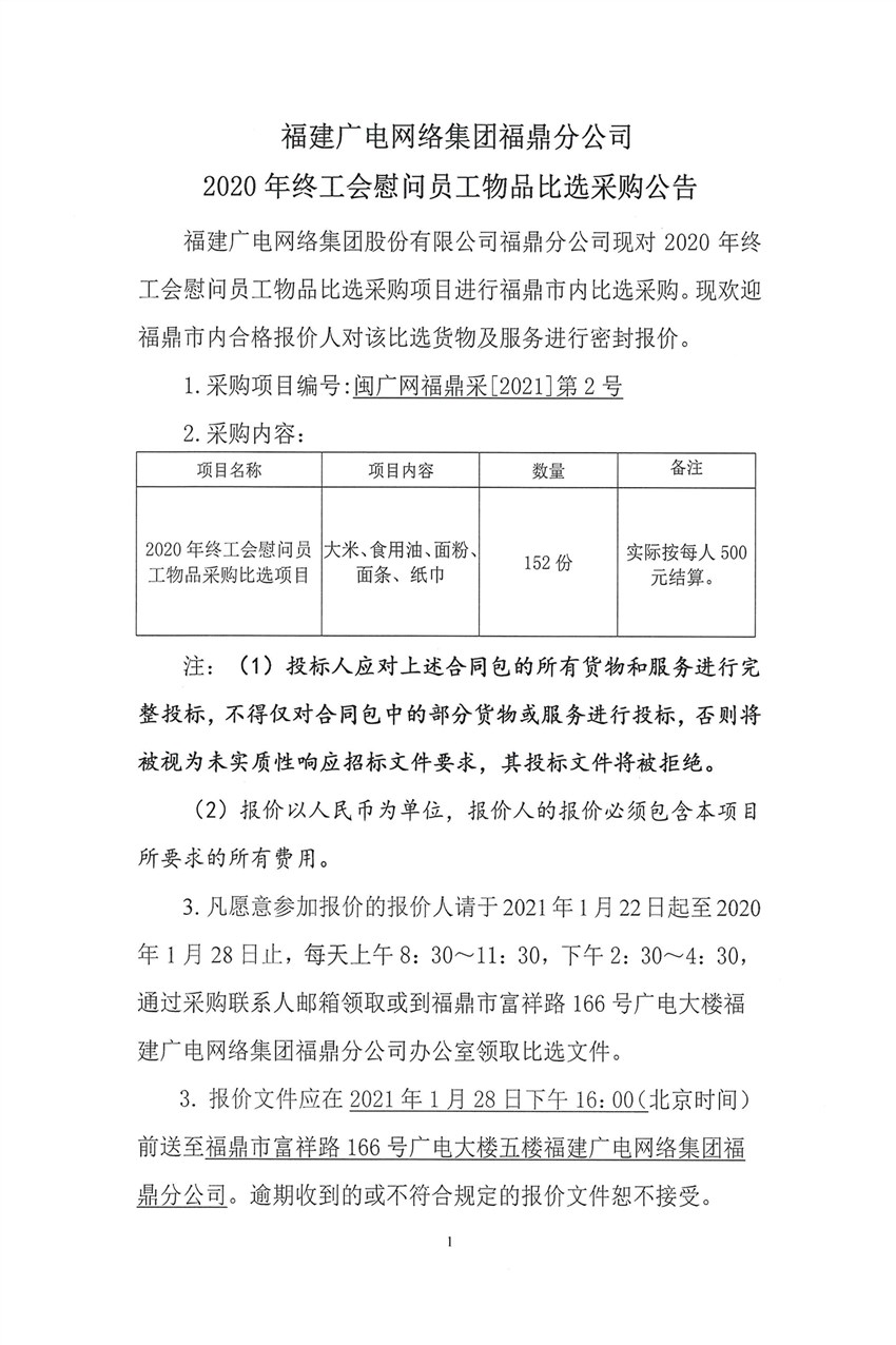 福鼎分公司工会2020年终慰问员工物品比选采购项目公告