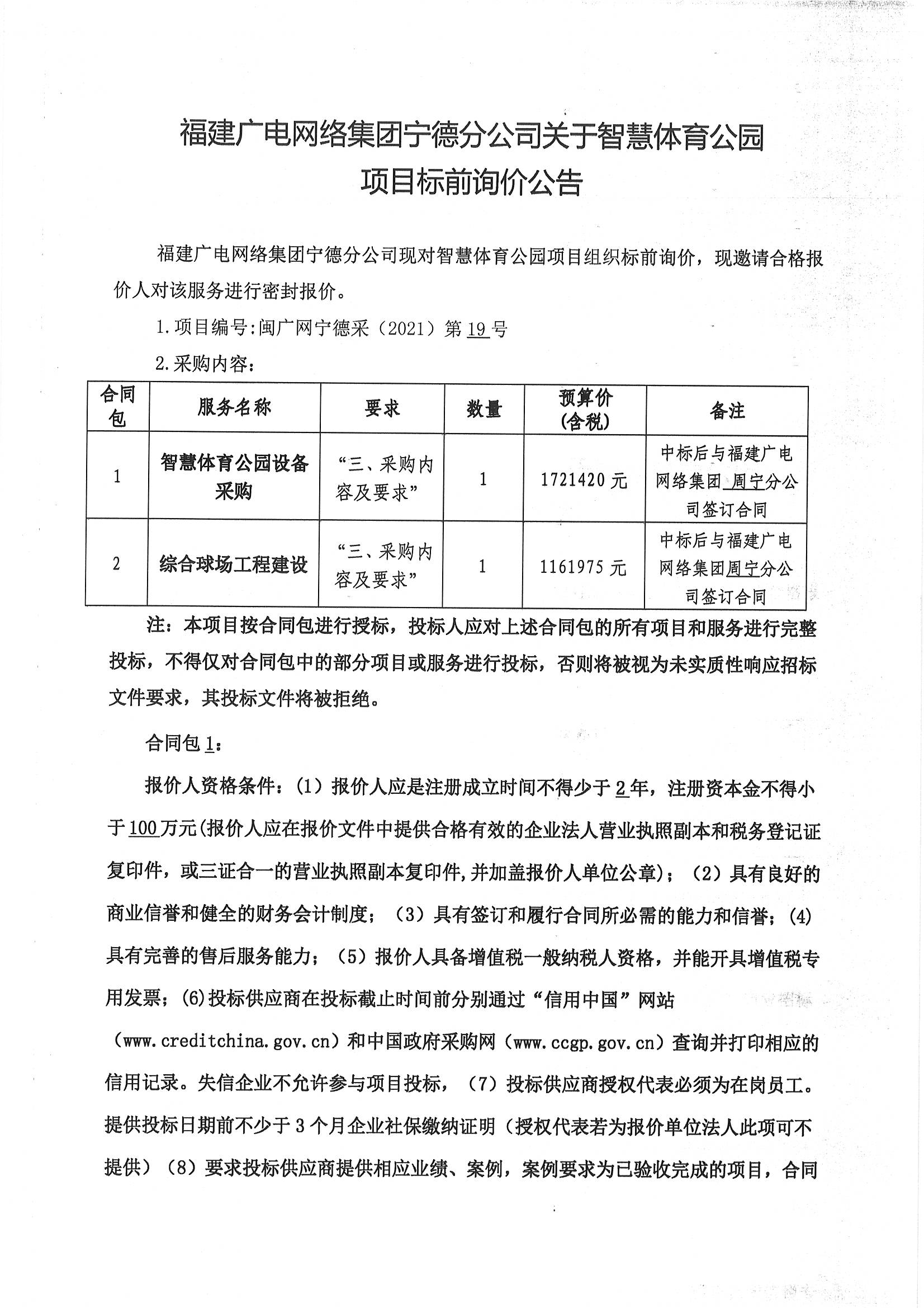 智慧体育公园项目标前询价公告