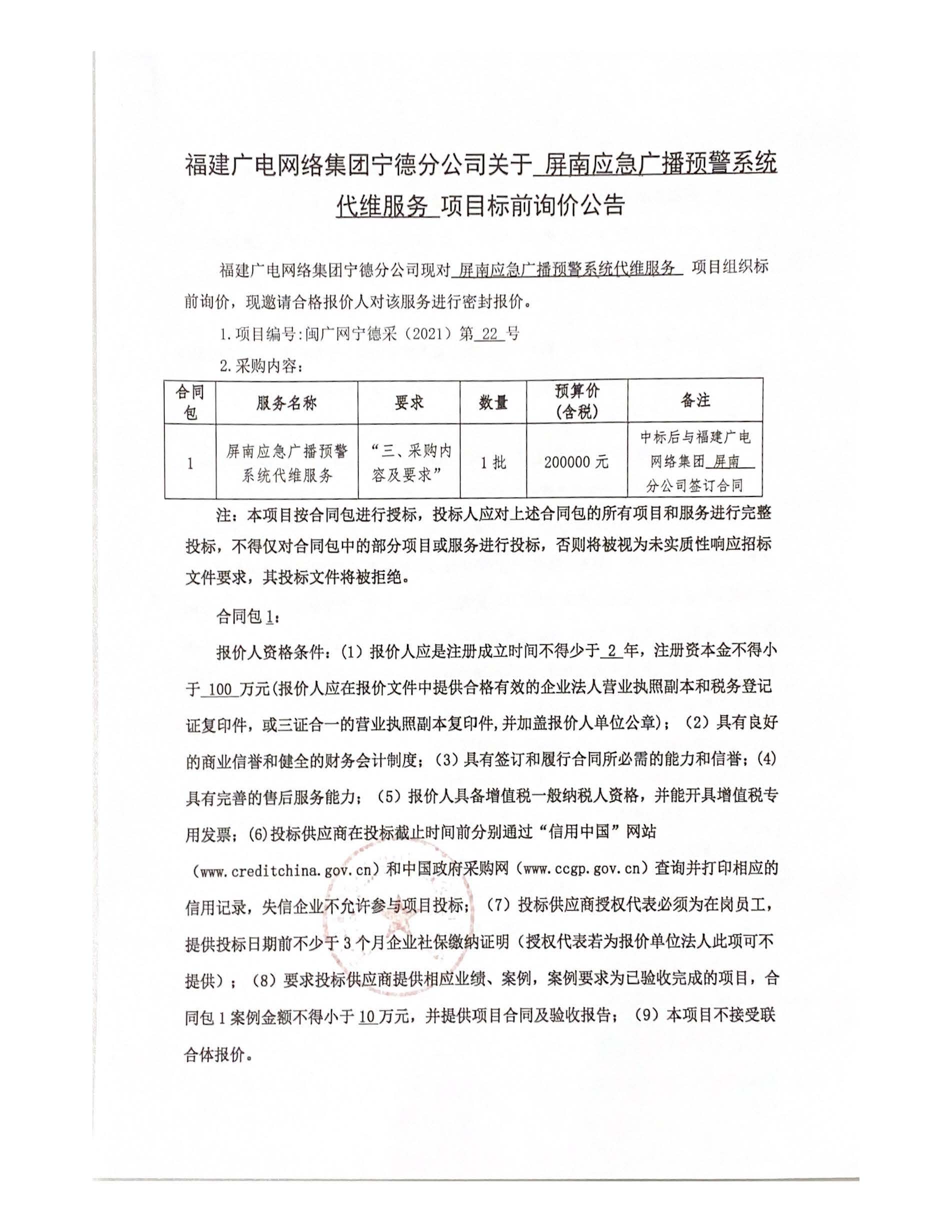 屏南应急广播预警系统代维服务项目标前询价公告