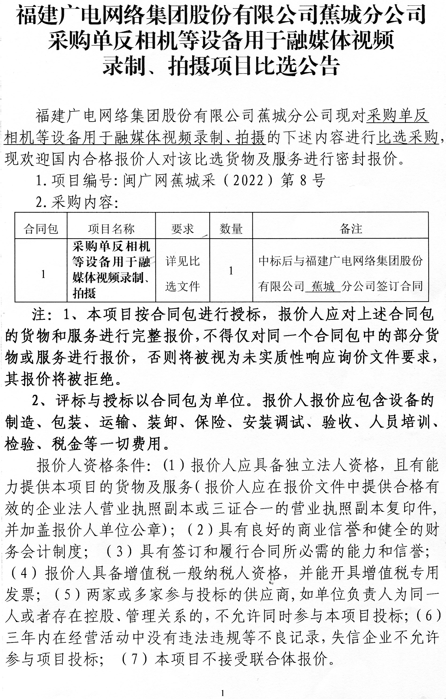 蕉城分公司采购单反相机等设备用于融媒体视频录制、拍摄项目比选公告