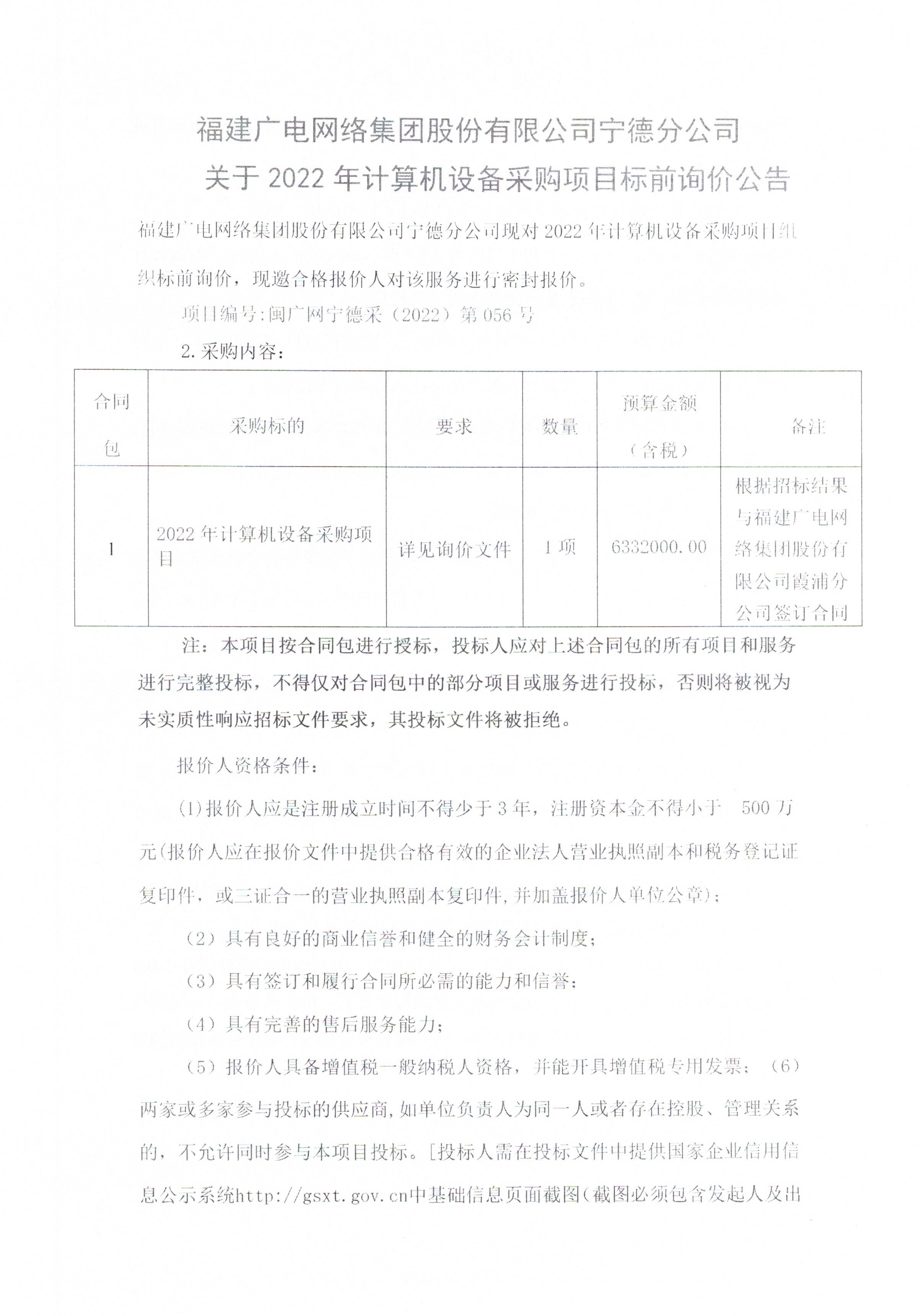 2022年计算机设备采购项目标前询价公告