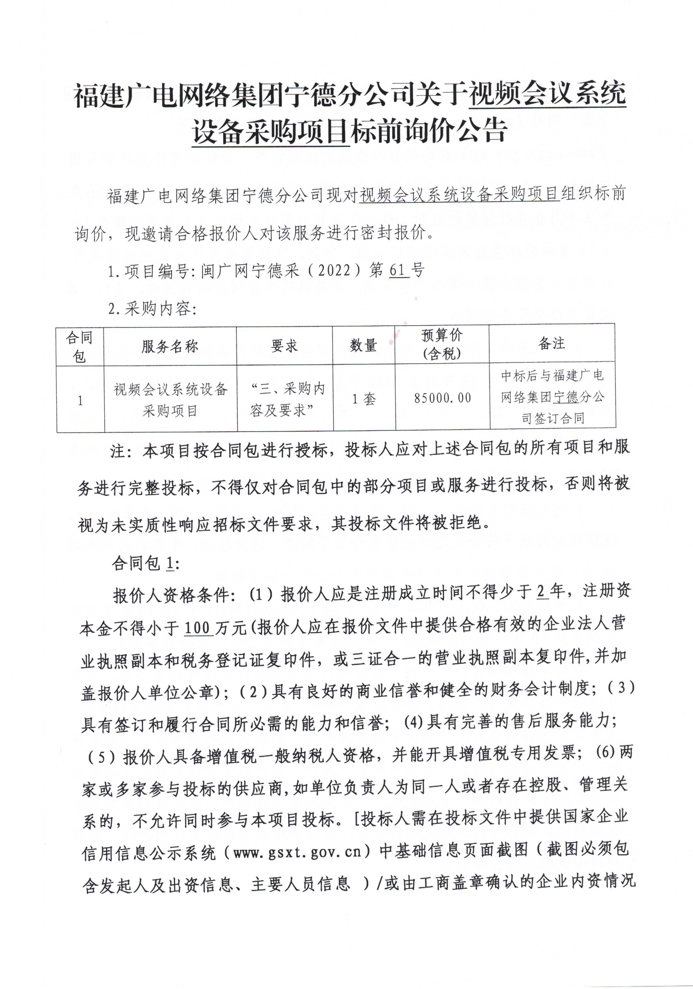宁德分公司视频会议系统设备采购项目标前询价公告