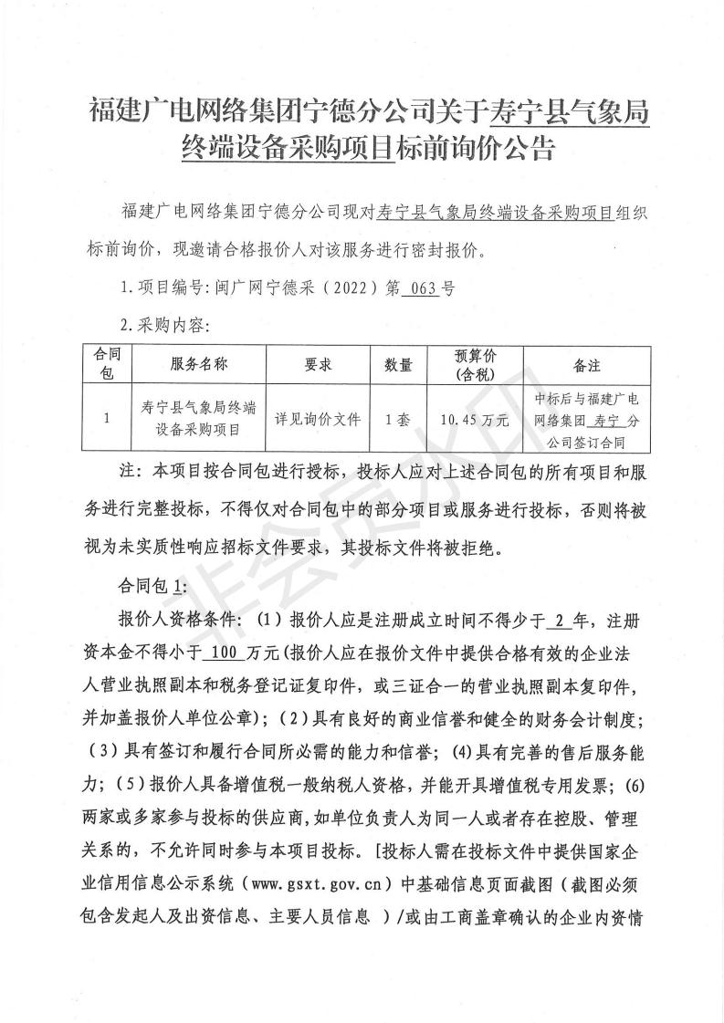 寿宁县气象局终端设备采购项目标前询价公告