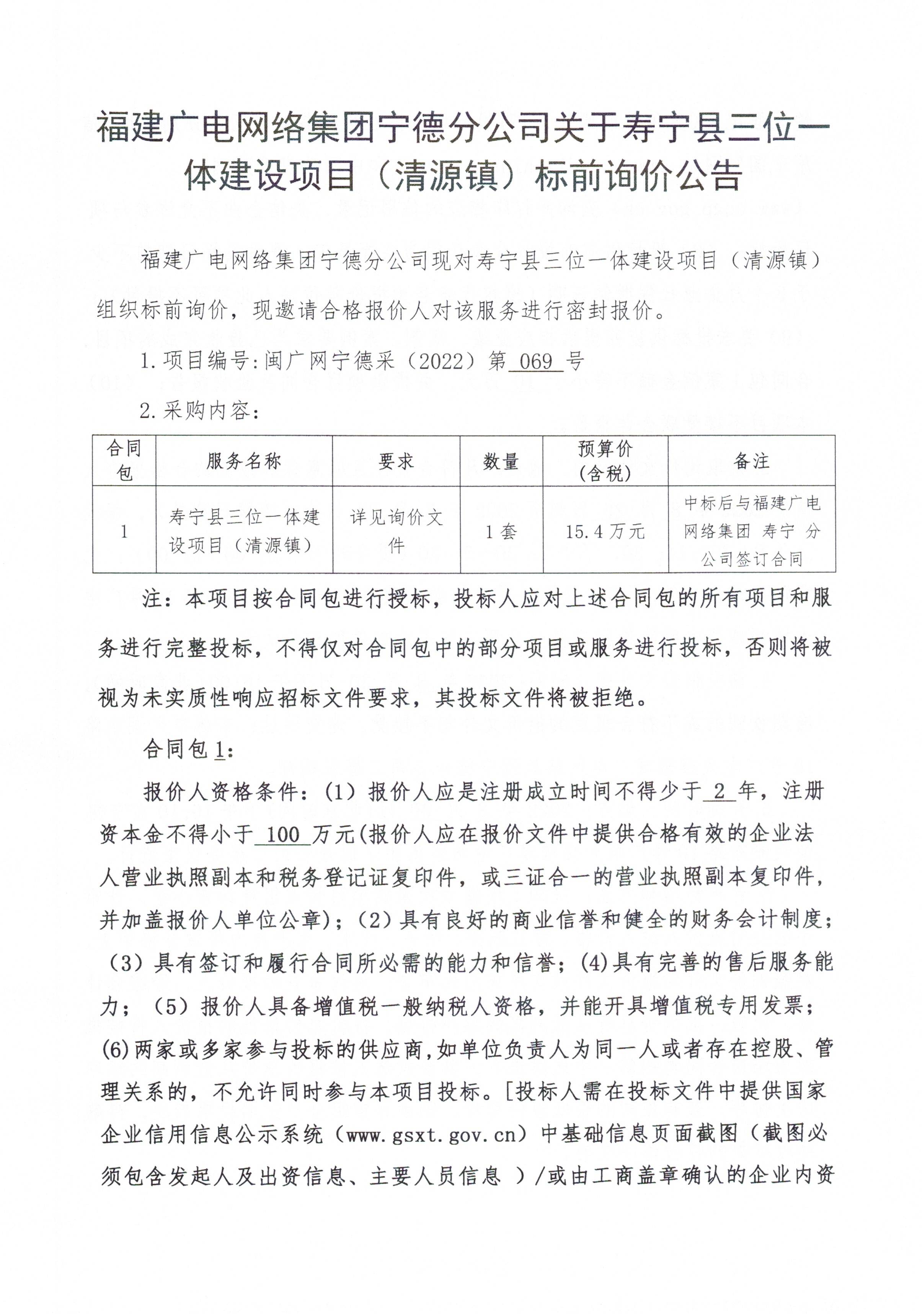 寿宁分公司三位一体建设项目(清源镇)标前询价公告