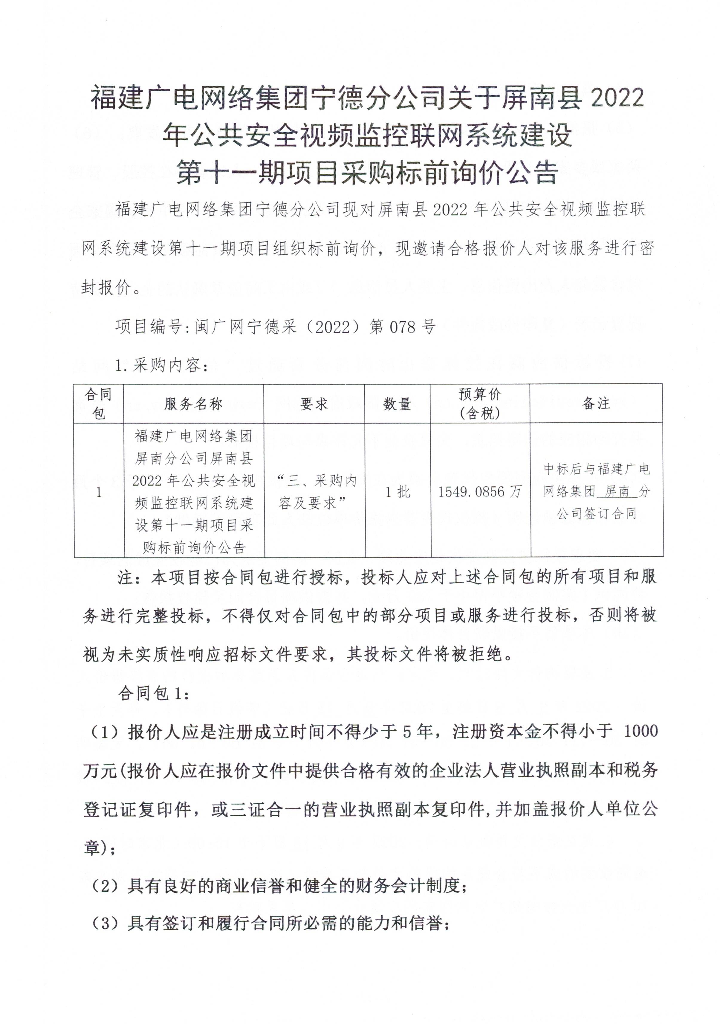 屏南县2022年公共安全视频监控联网系统建设第十一期项目采购标前询价公告