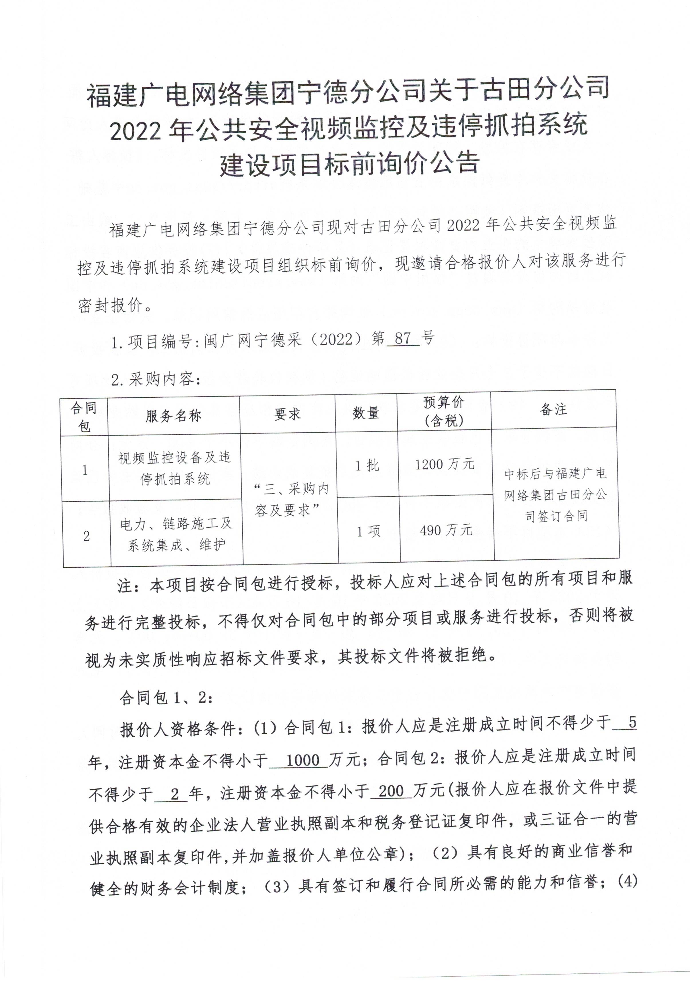 古田分公司2022年公共安全视频及违停抓拍系统建设项目标前询价公告