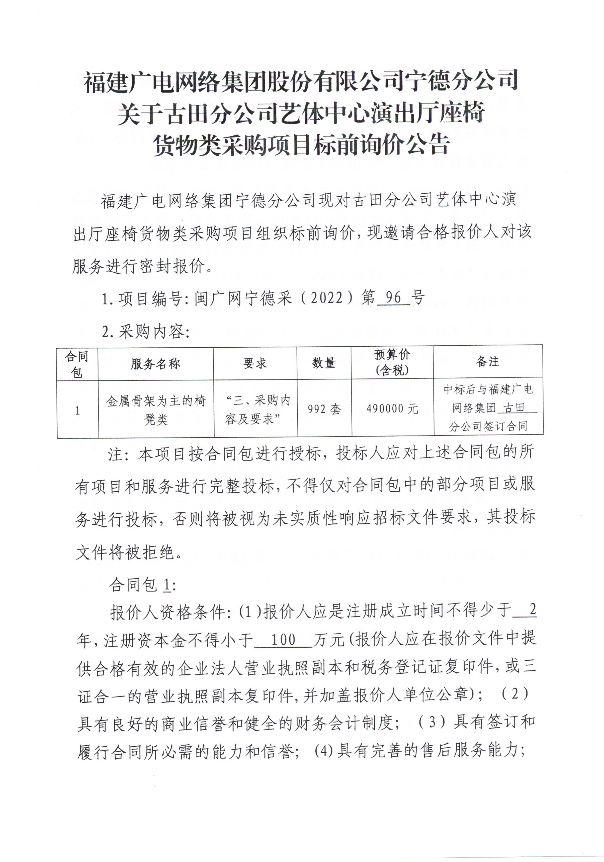 古田分公司艺体中心演出厅座椅货物类采购项目标前询价公告