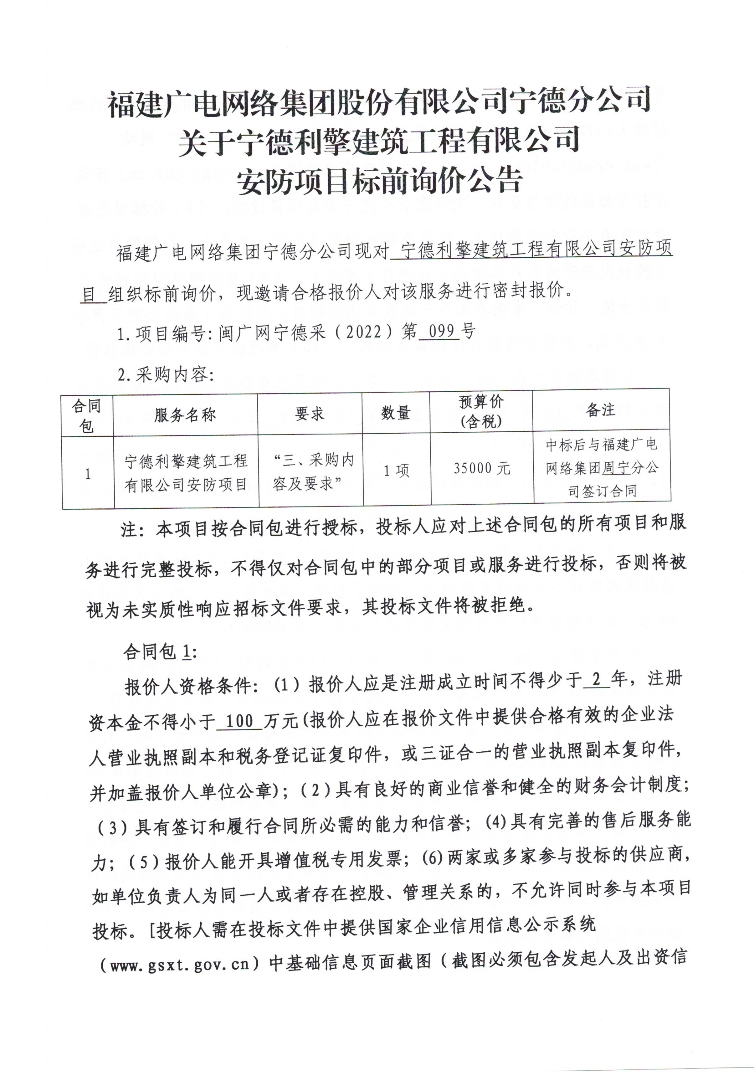 宁德分公司关于利擎建筑工程有限公司安防项目标前询价公告