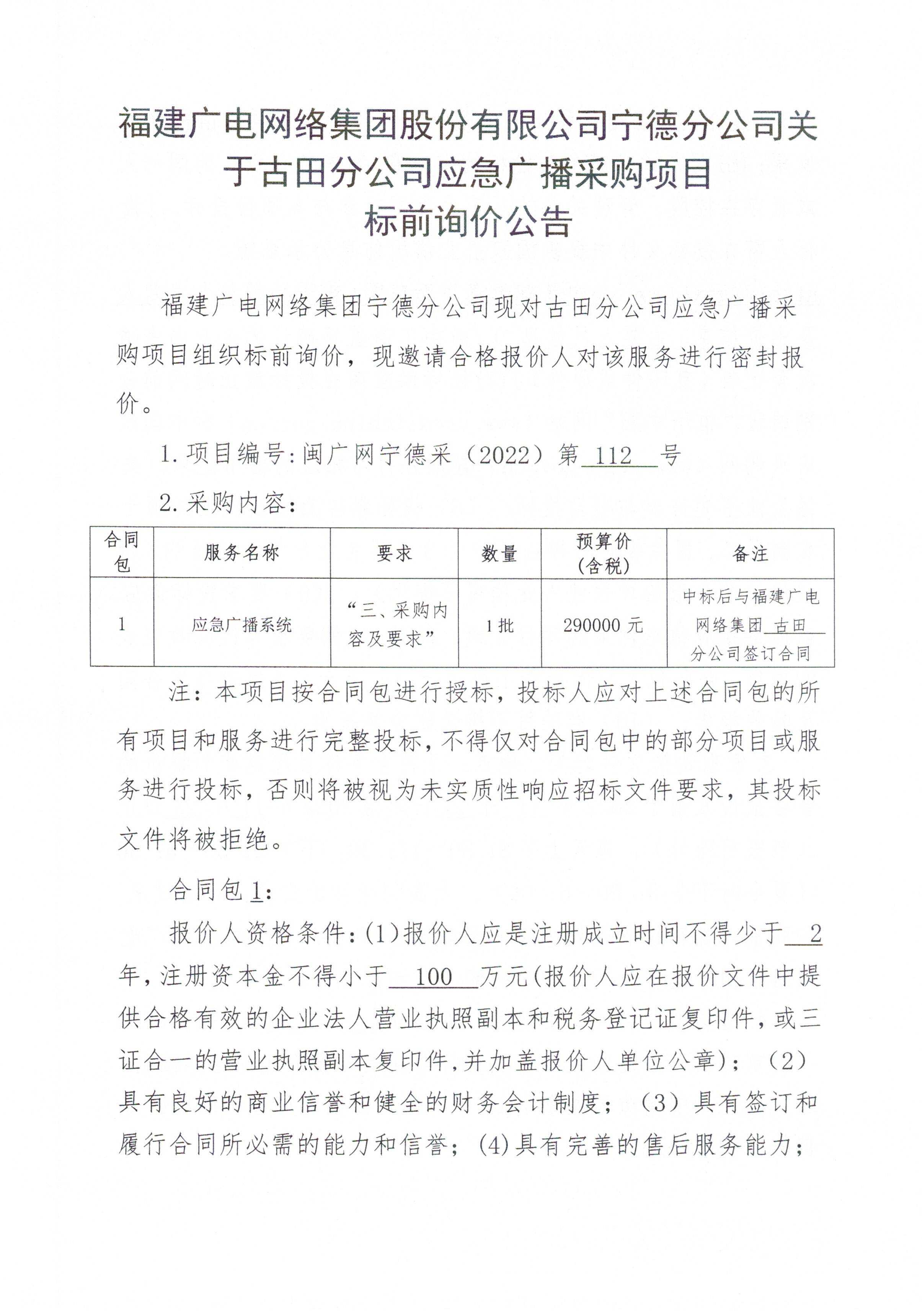 宁德分公司关于古田分公司应急广播采购项目标前询价公告