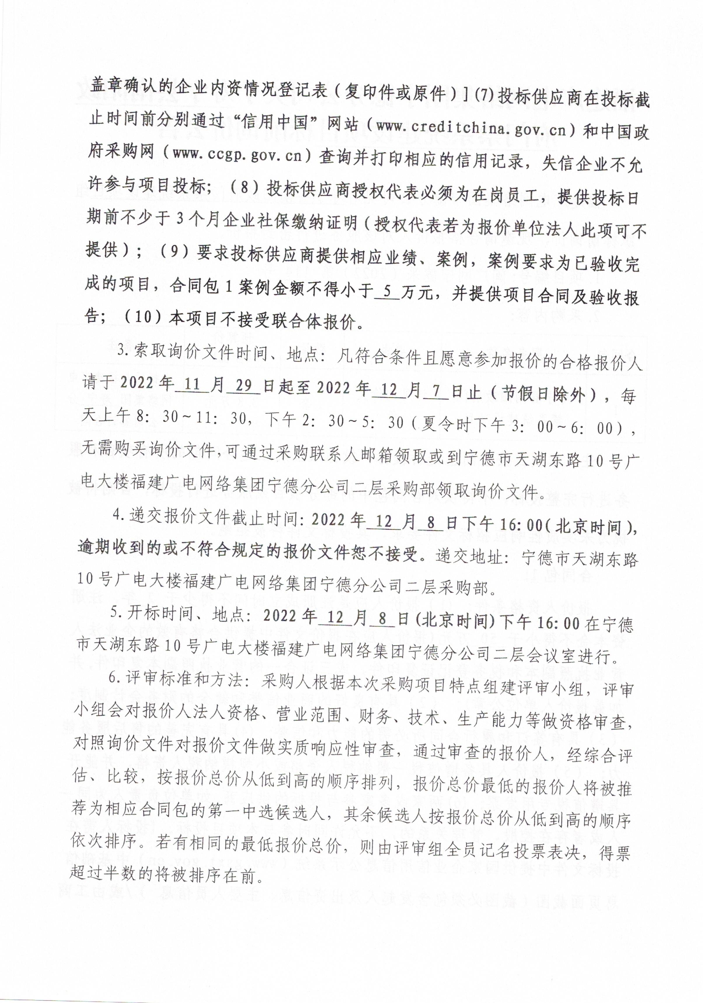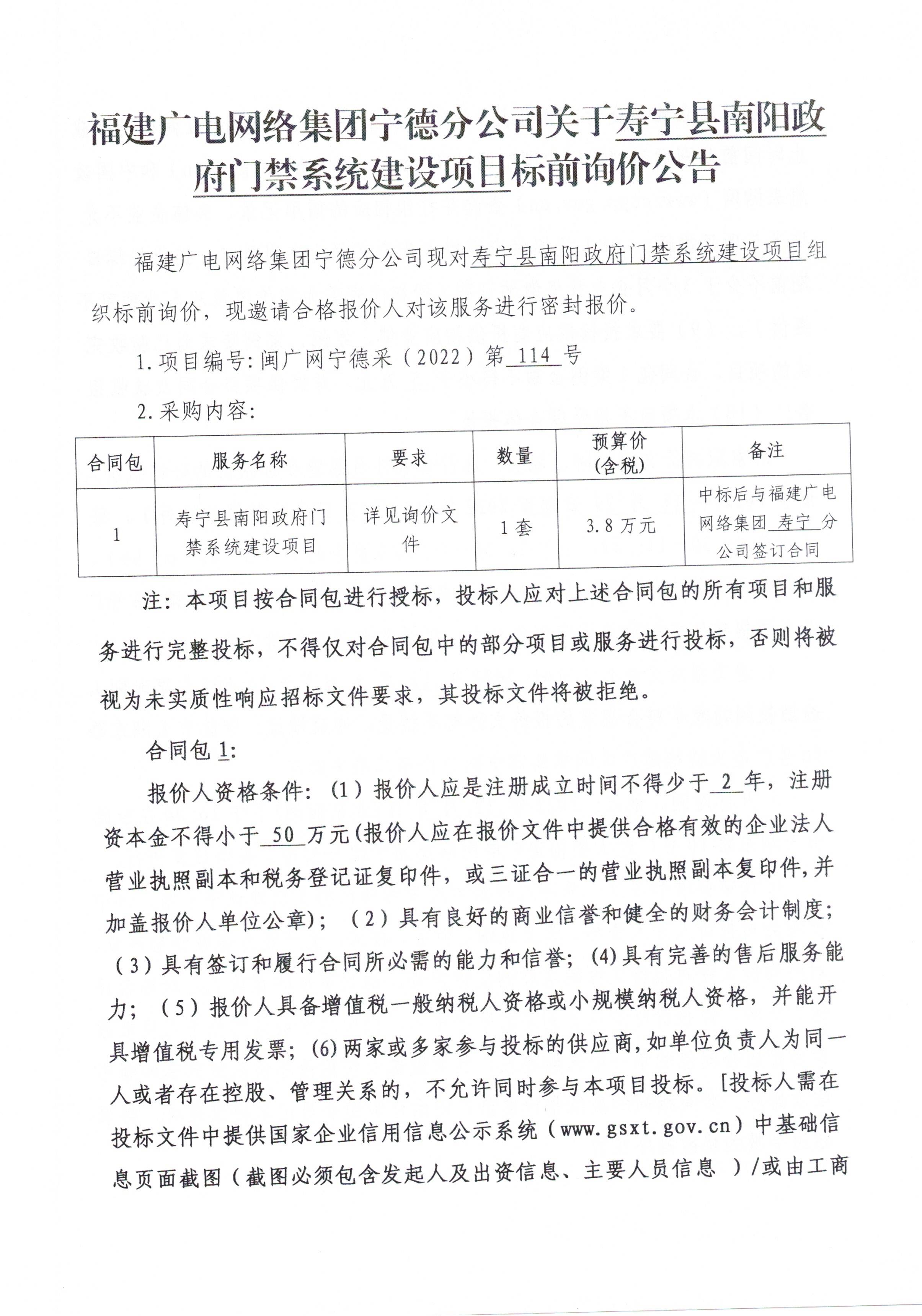 宁德分公司关于寿宁县南阳政府门禁系统建设项目标前询价公告