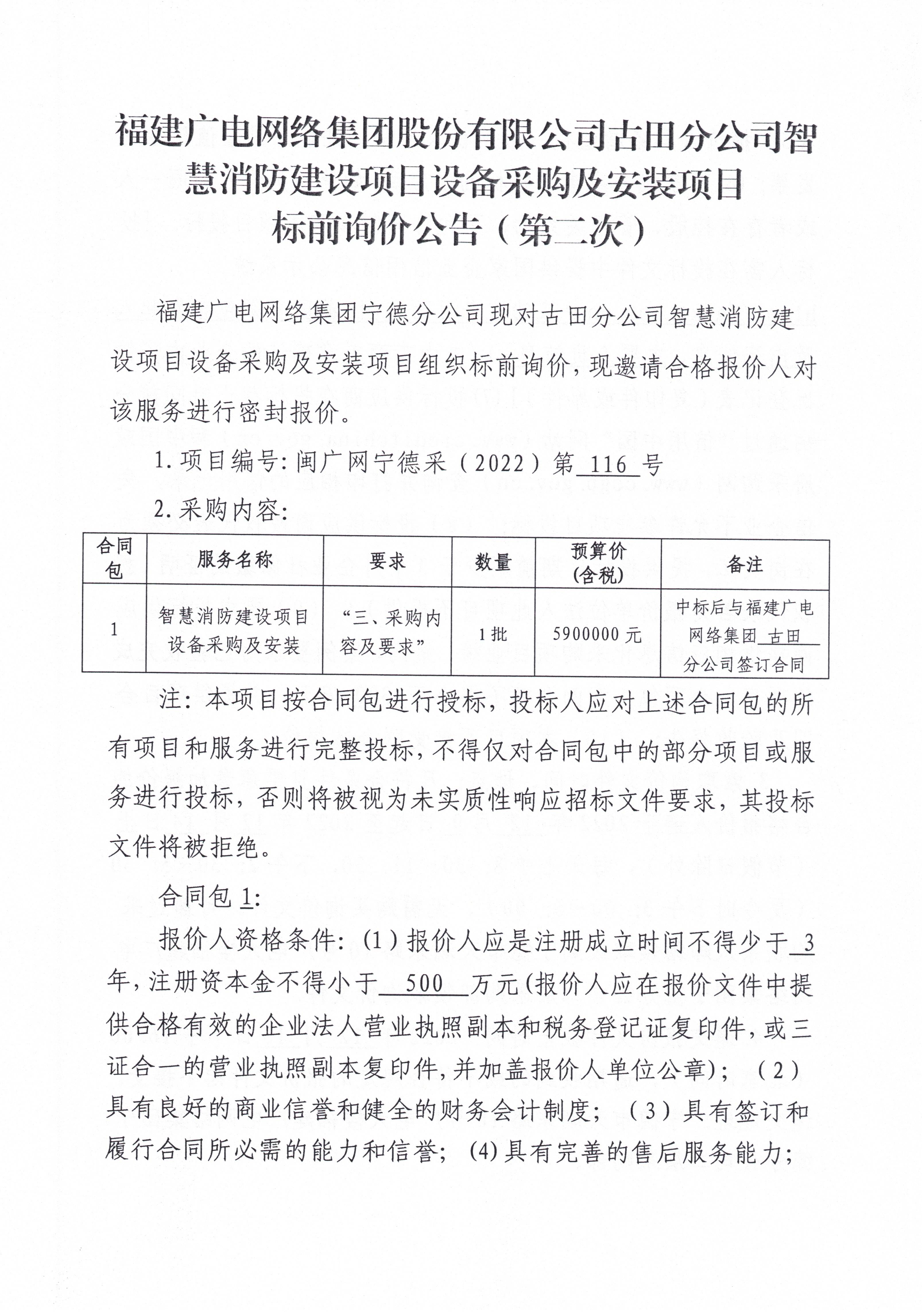 古田分公司智慧消防建设设备采购及安装项目标前询价公告(第二次)
