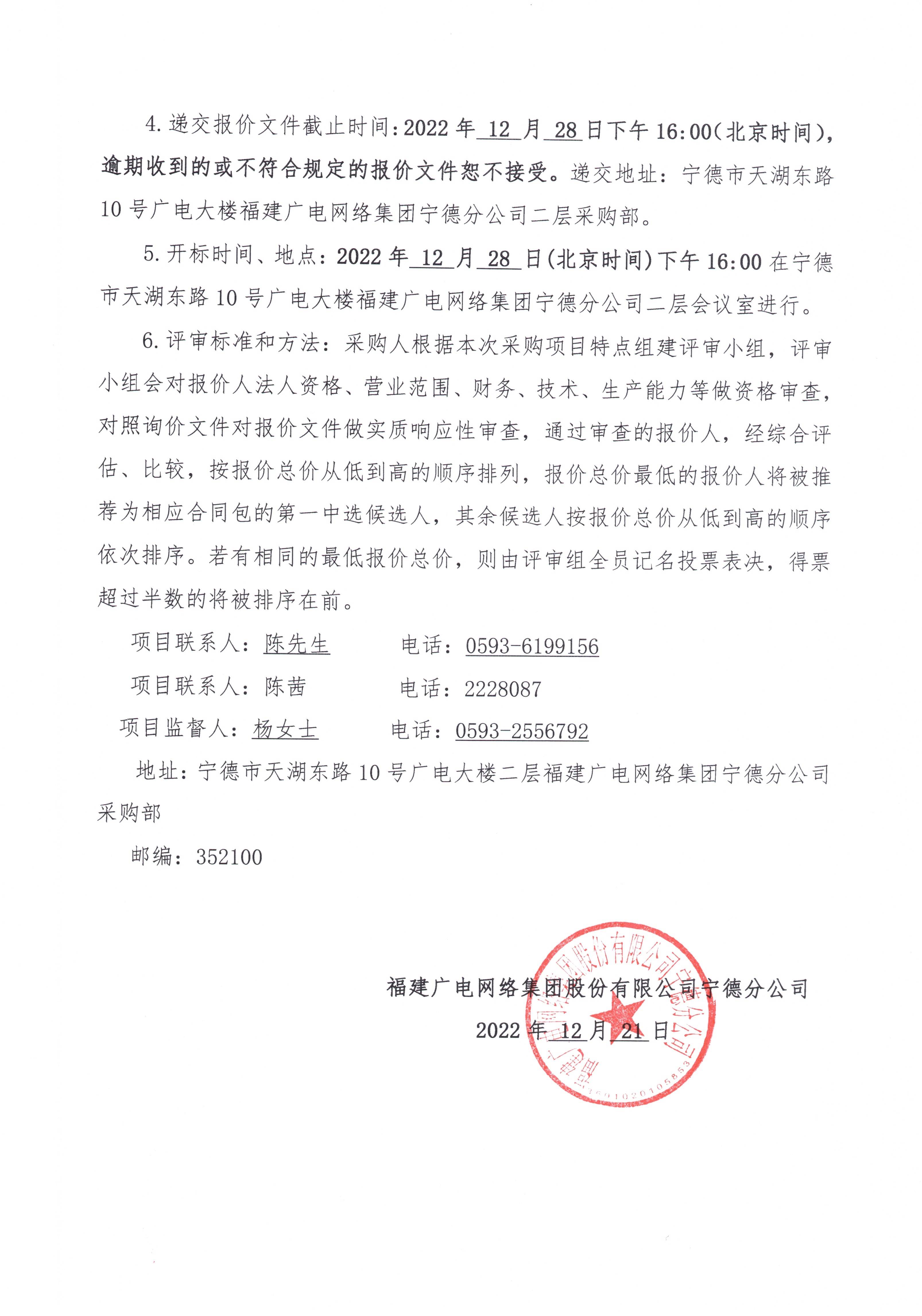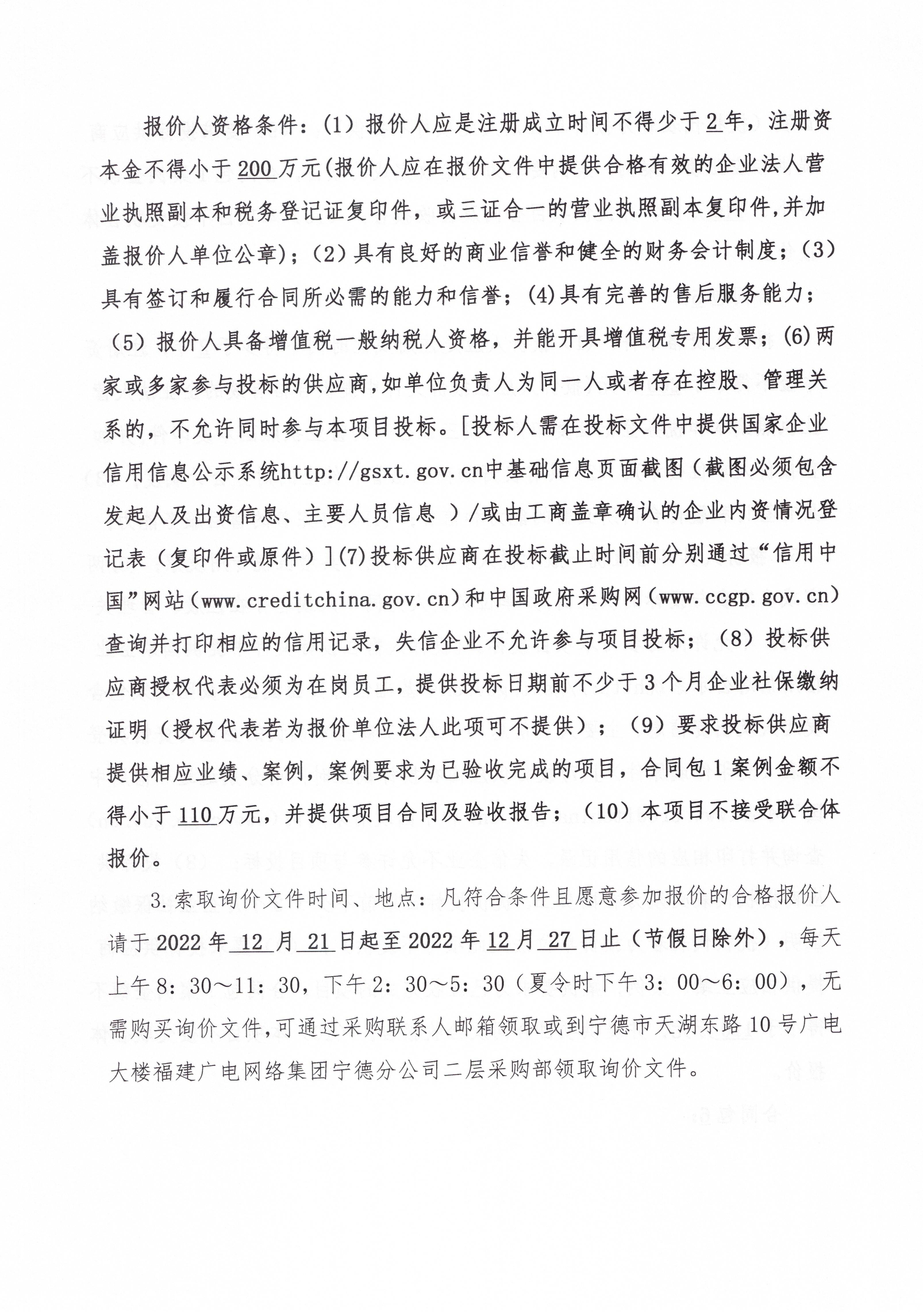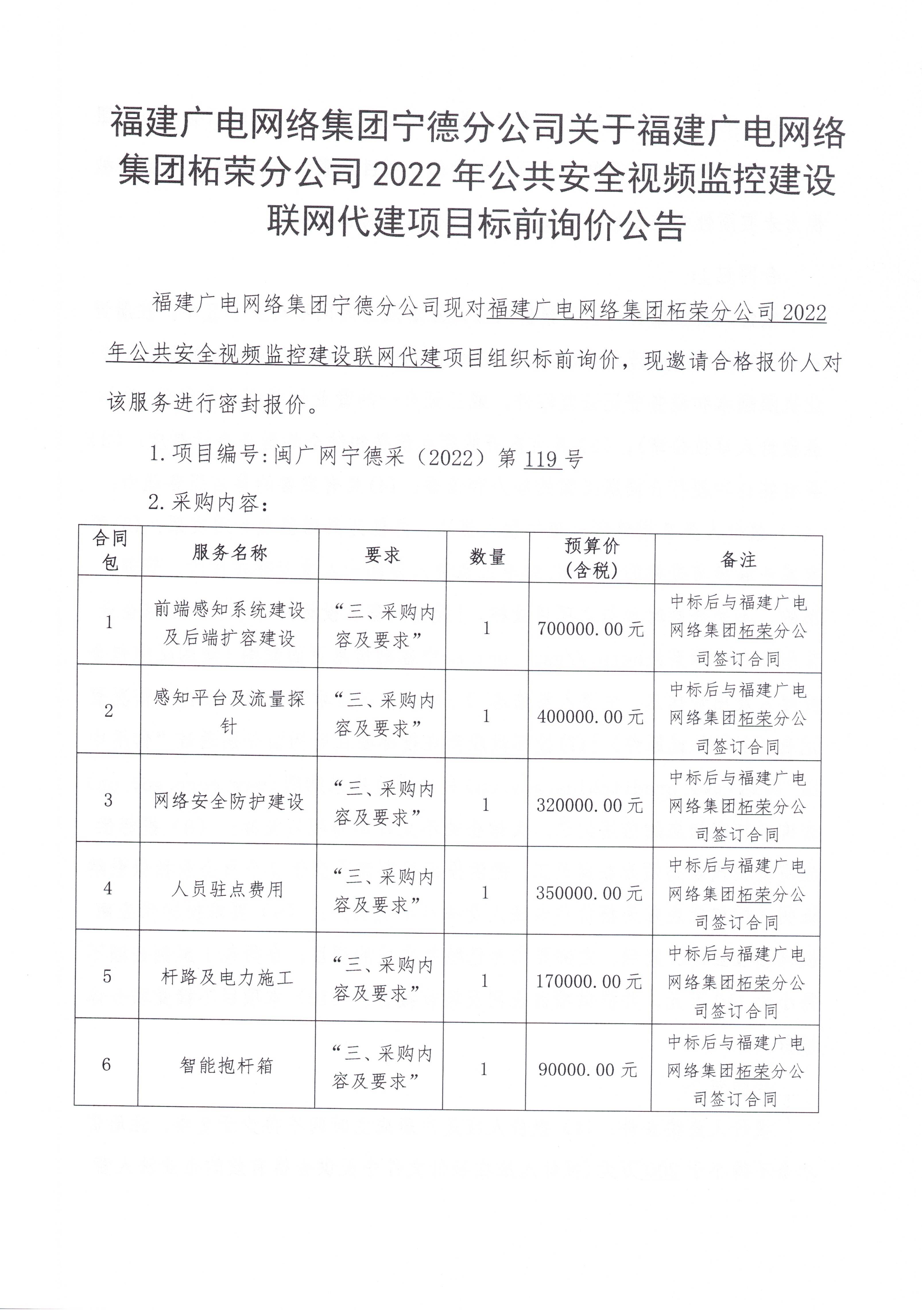 福建广电网络集团柘荣分公司2022年公共安全视频监控建设联网代建项目标前询价公告