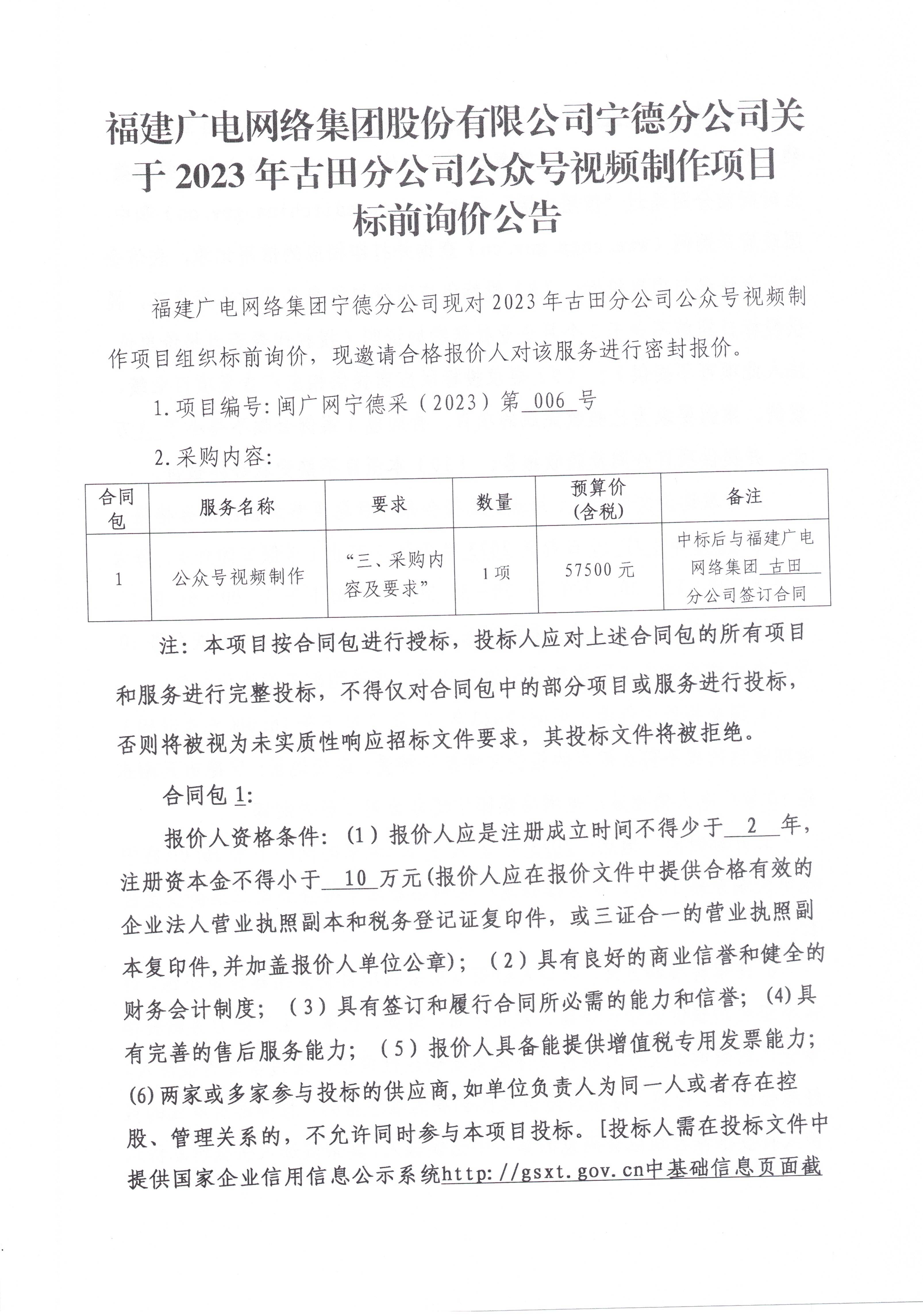 2023年古田分公司公众号视频制作项目标前询价公告