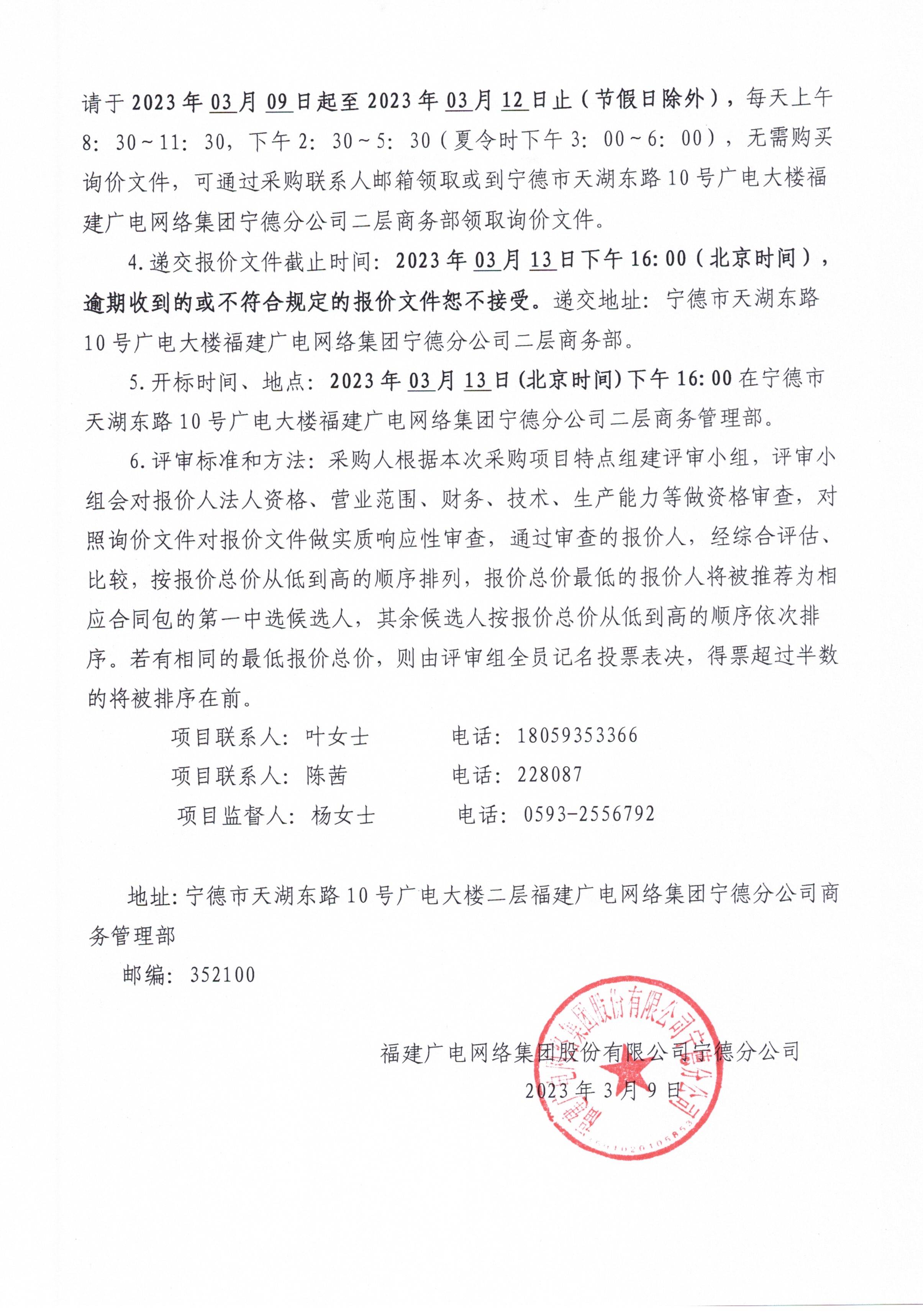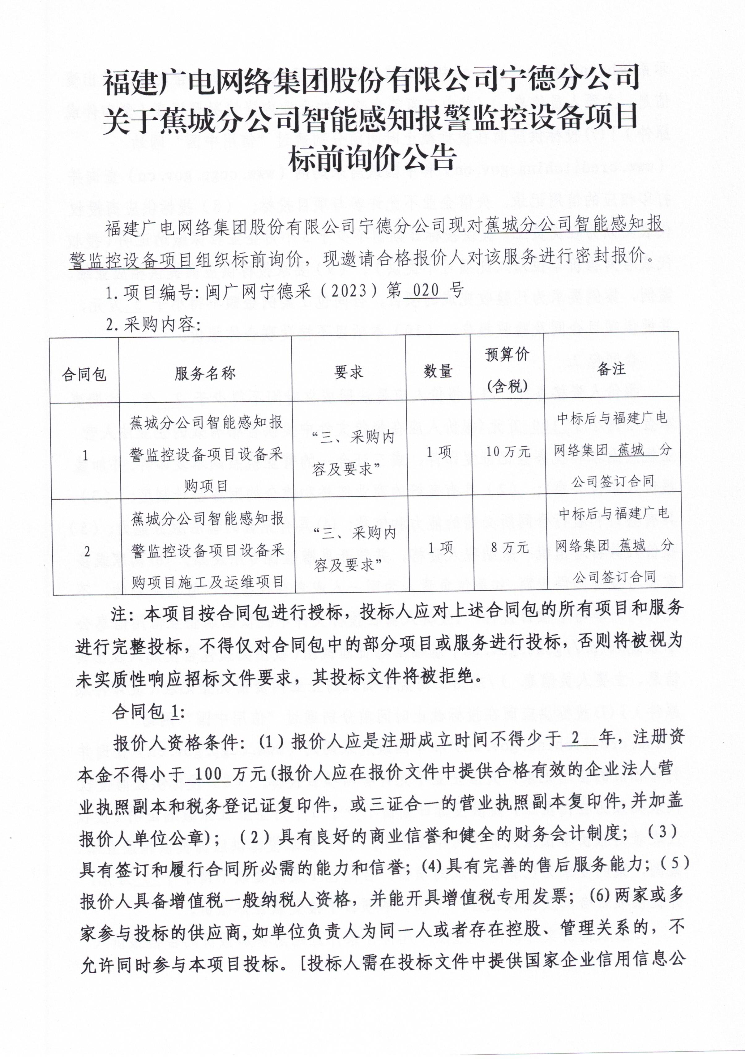 福建广电网络集团股份有限公司宁德分公司关于蕉城分公司智能感知报警监控设备项目标前询价公告