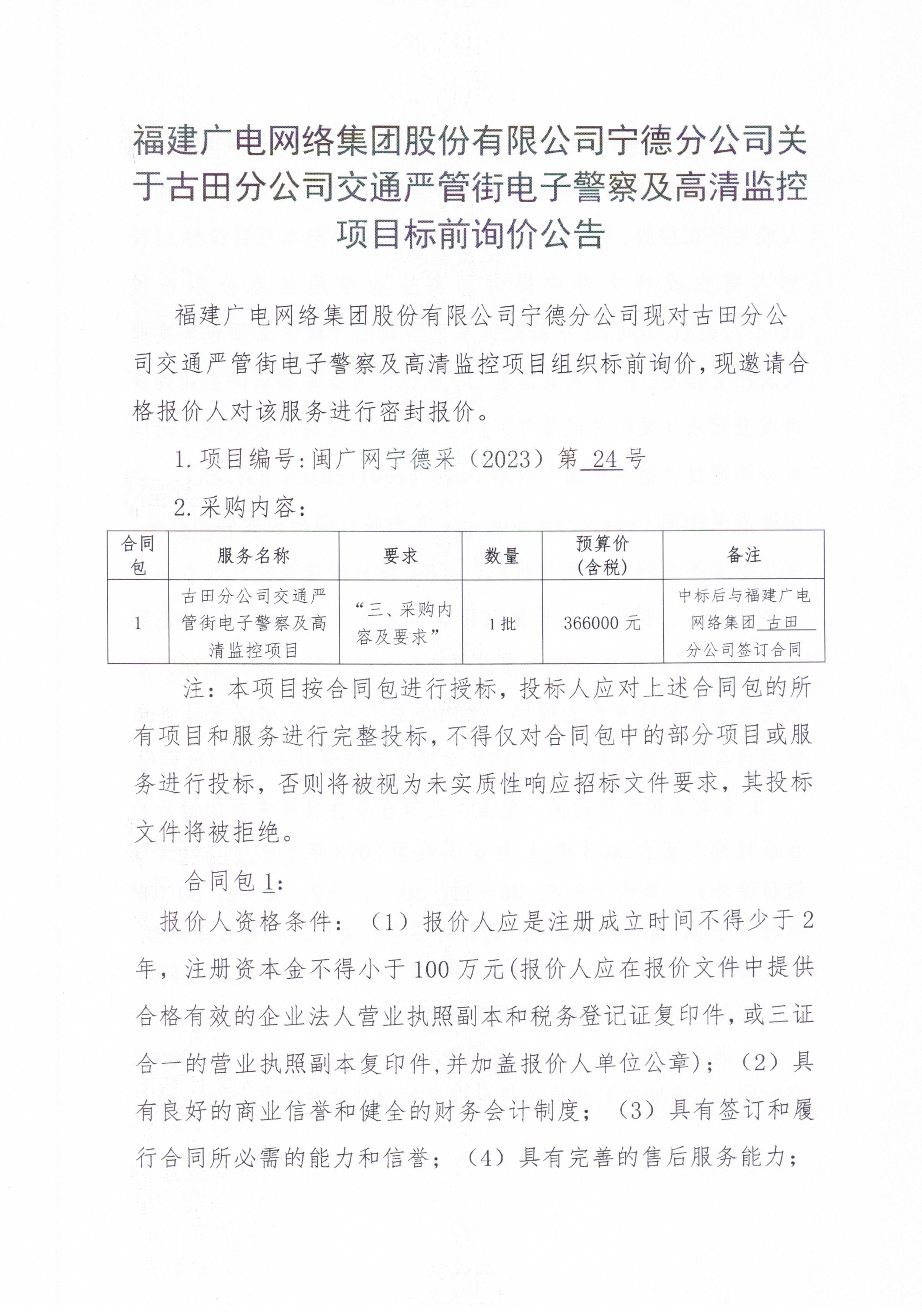 福建广电网络集团股份有限公司宁德分公司关于古田分公司交通严管街电子警察及高清监控项目标前询价公告