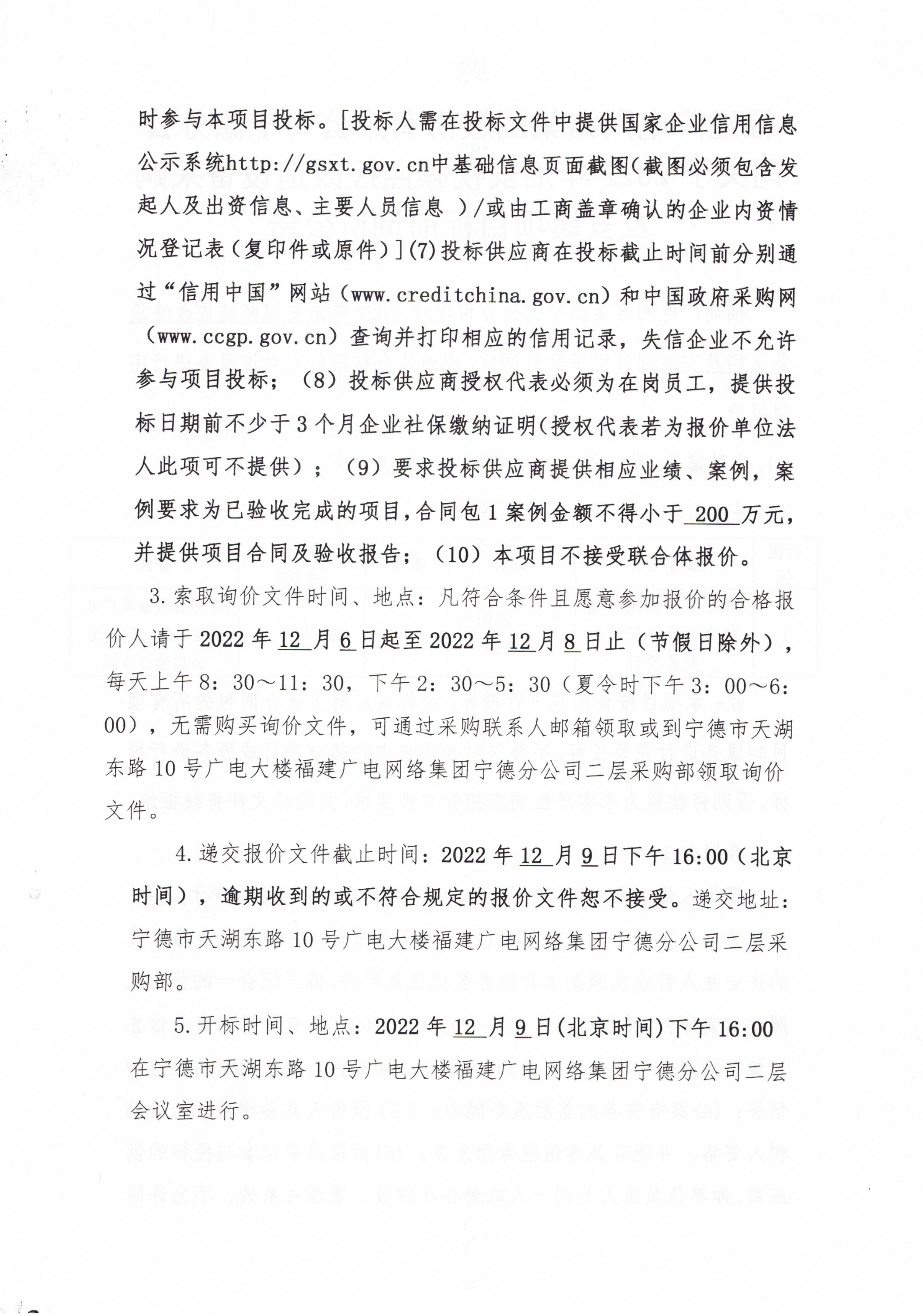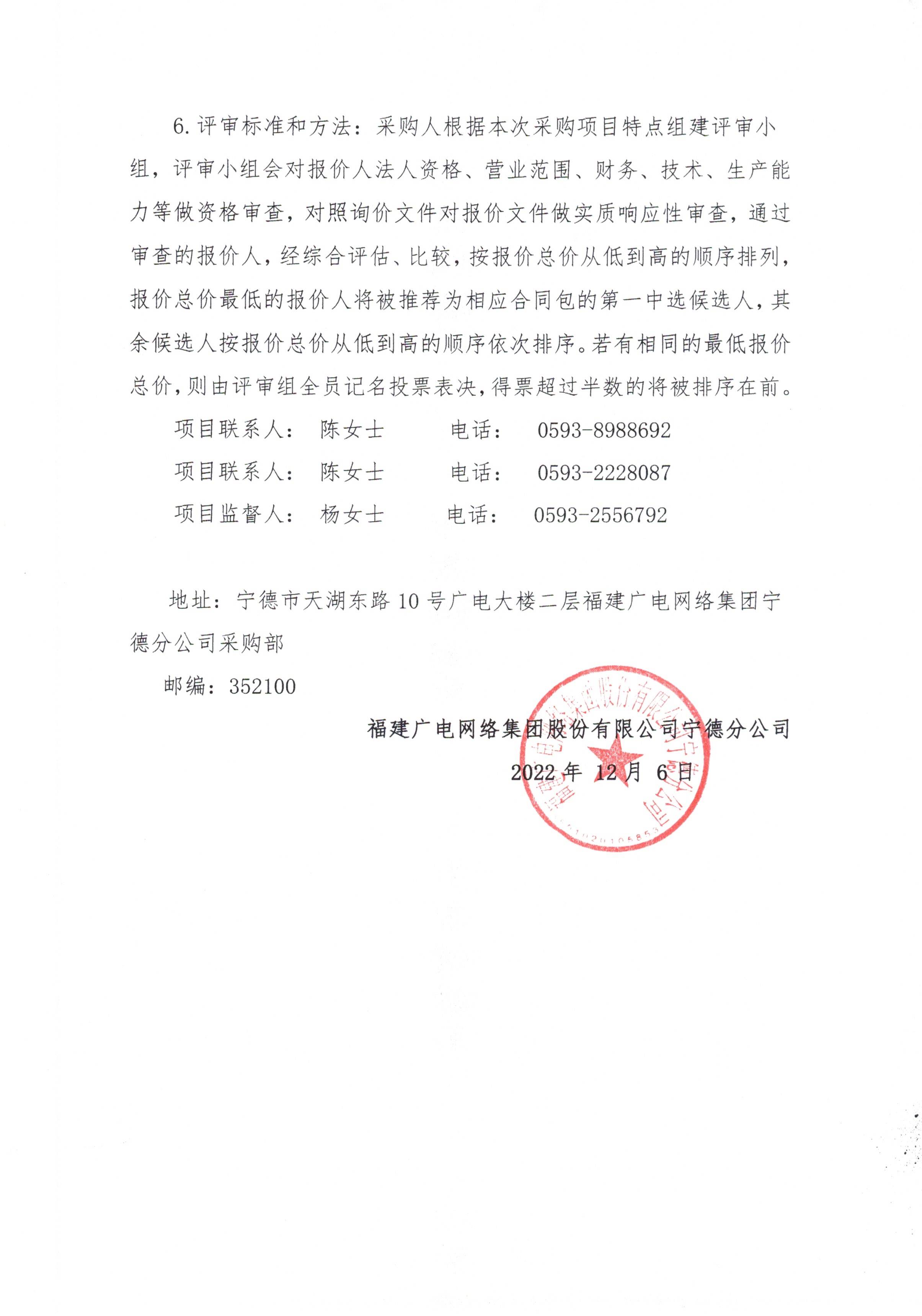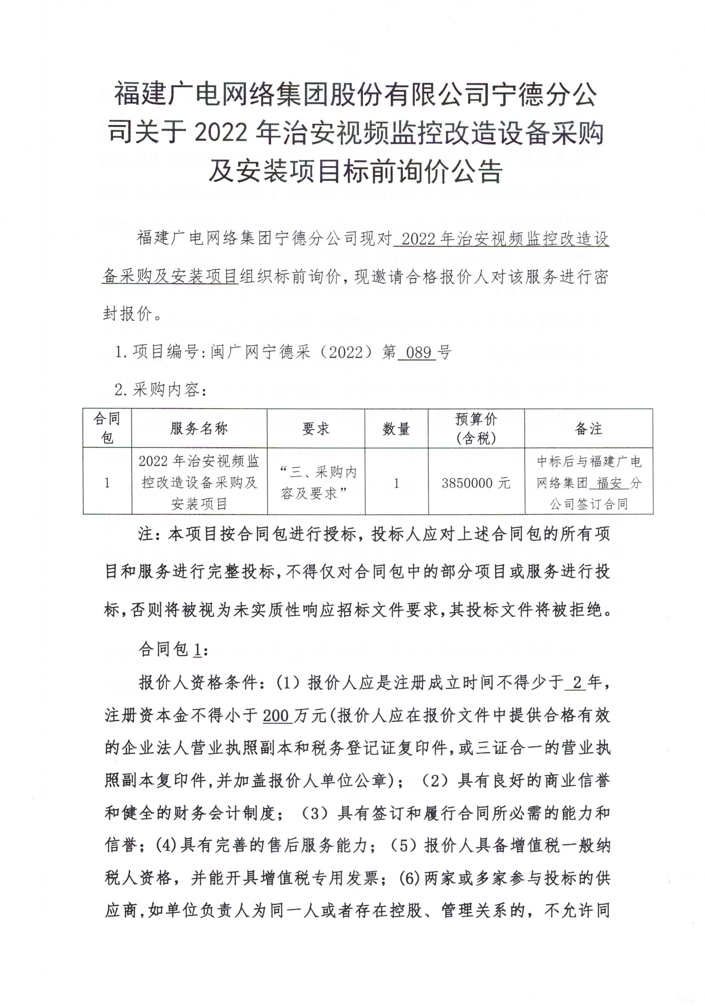 福建广电网络集团股份有限公司宁德分公司关于2022年治安视频监控改造设备采购及安装项目标前询价公告