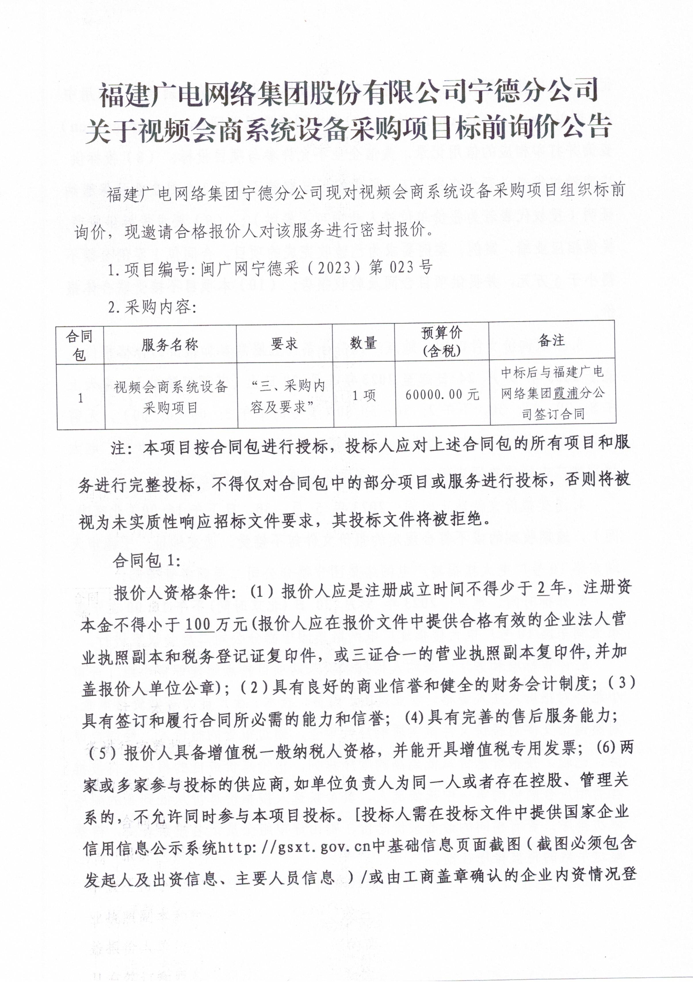 闽广网宁德采(2023)第023号福建广电网络集团股份有限公司宁德分公司关于霞浦分公司视频会商系统设备采购项目