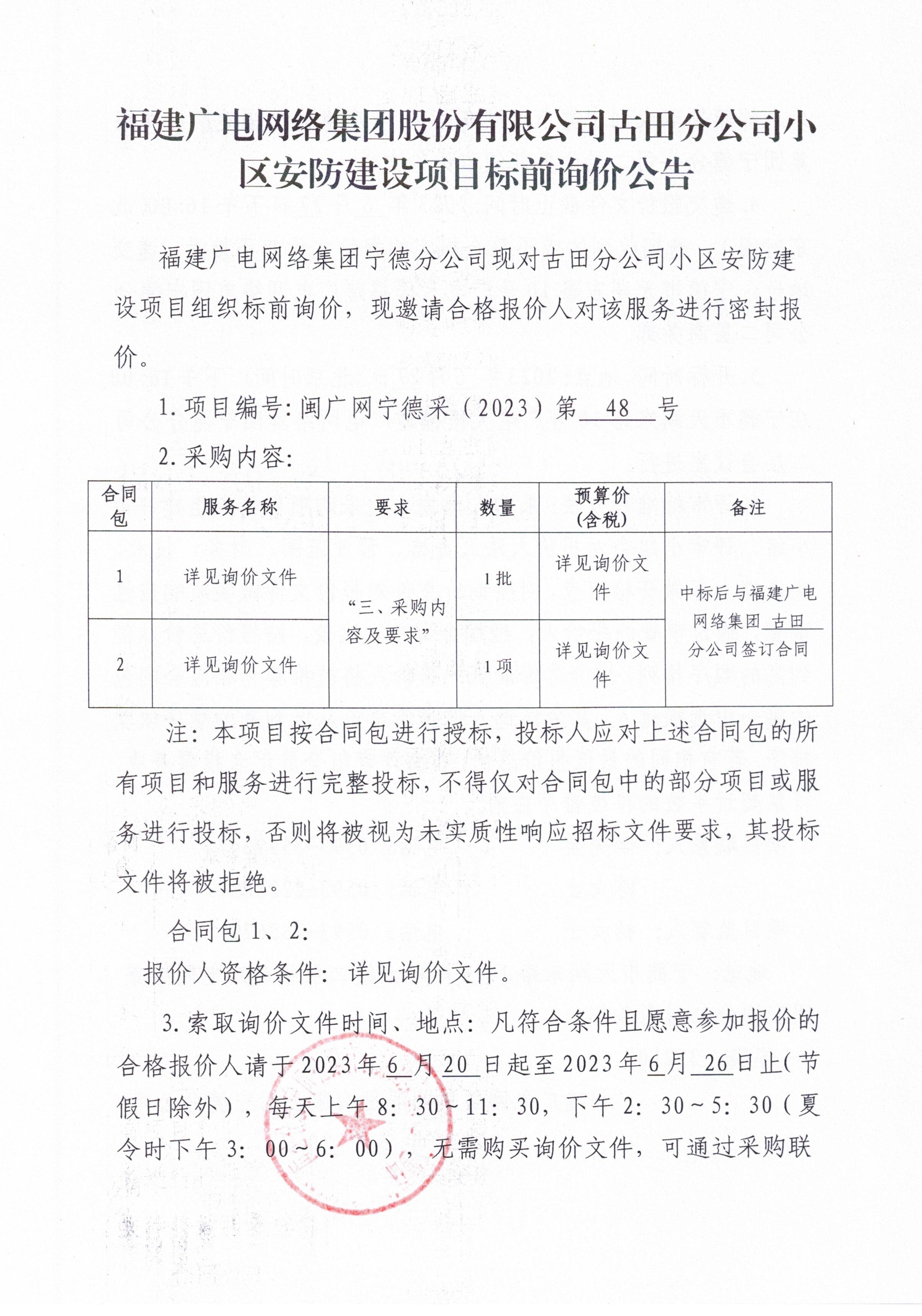 福建广电网络集团宁德分公司关于古田分公司小区安防建设项目公告