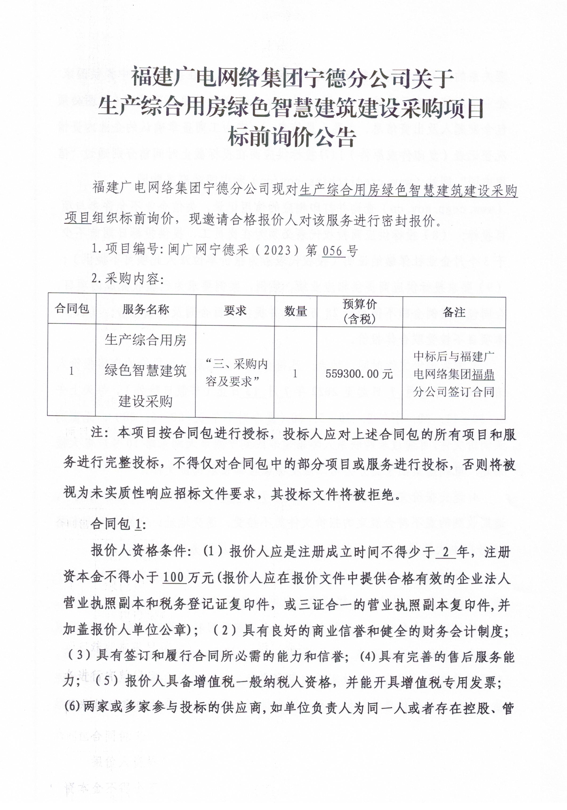 福建广电网络集团宁德分公司关于生产综合用房绿色智慧建筑建设采购项目标前询价公告