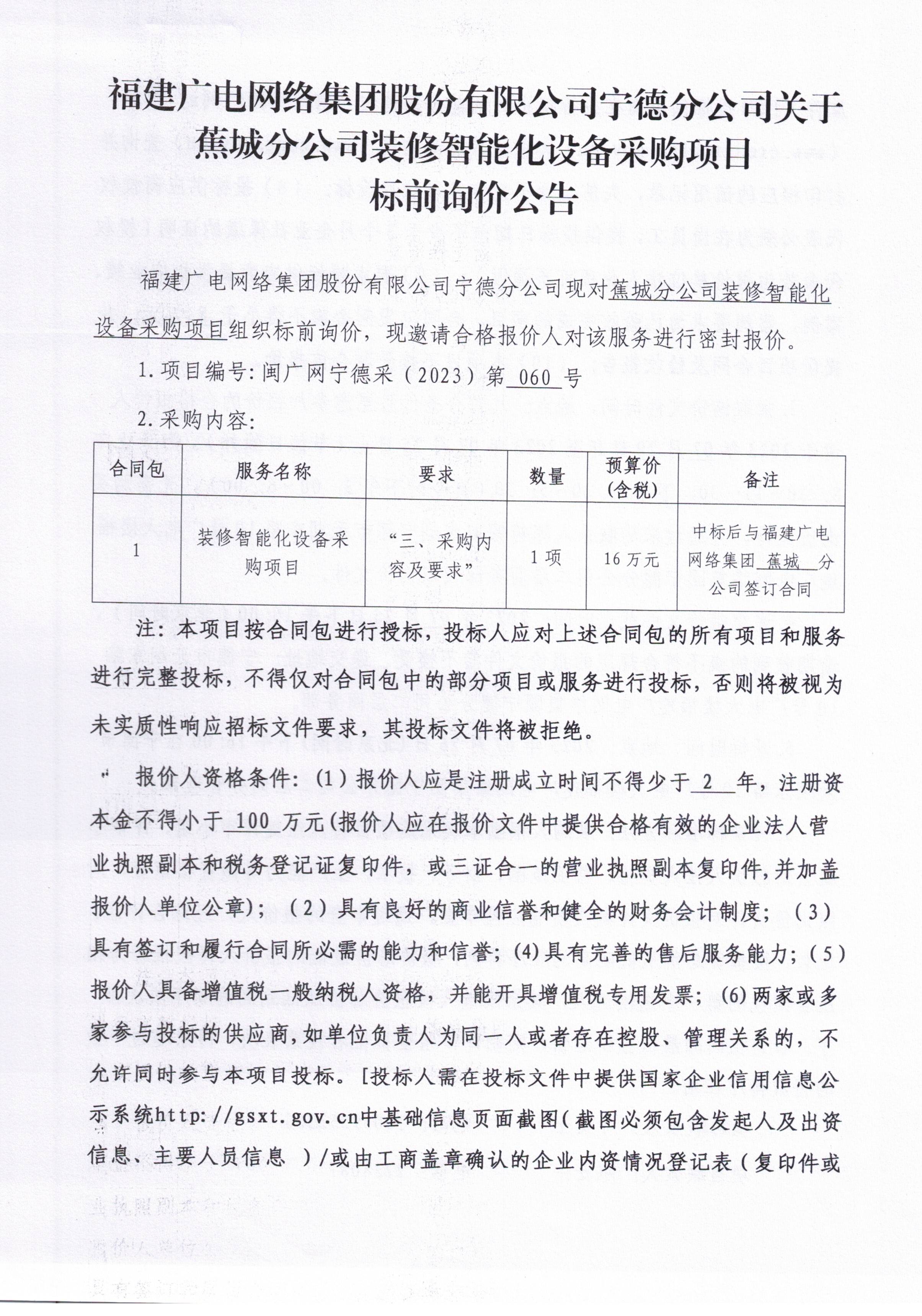 福建广电网络集团宁德分公司关于蕉城分公司装修智能化设备采购项目公告
