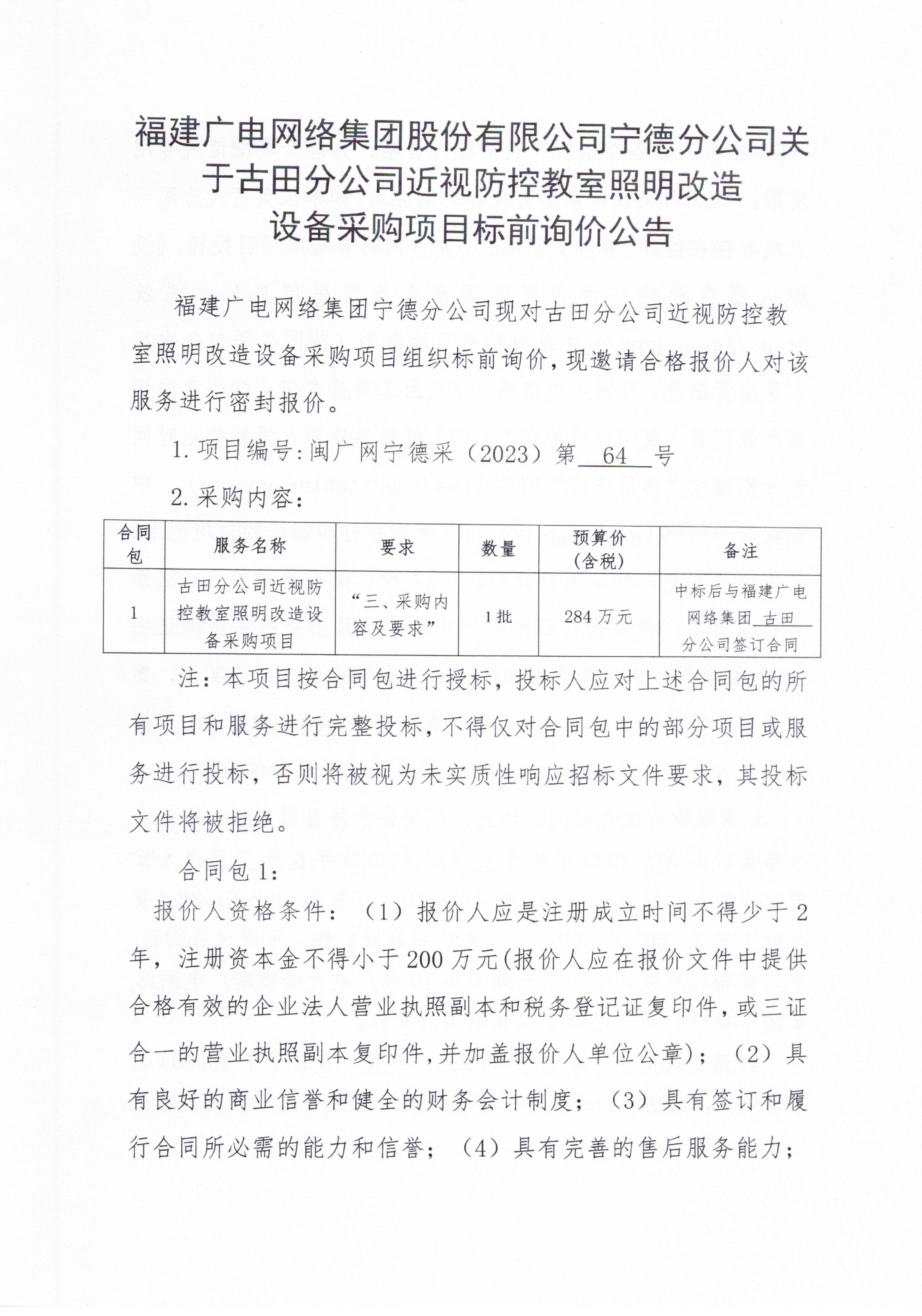 福建广电网络集团股份有限公司宁德分公司关于古田分公司近视防控教室照明改造设备采购项目标前询价公告