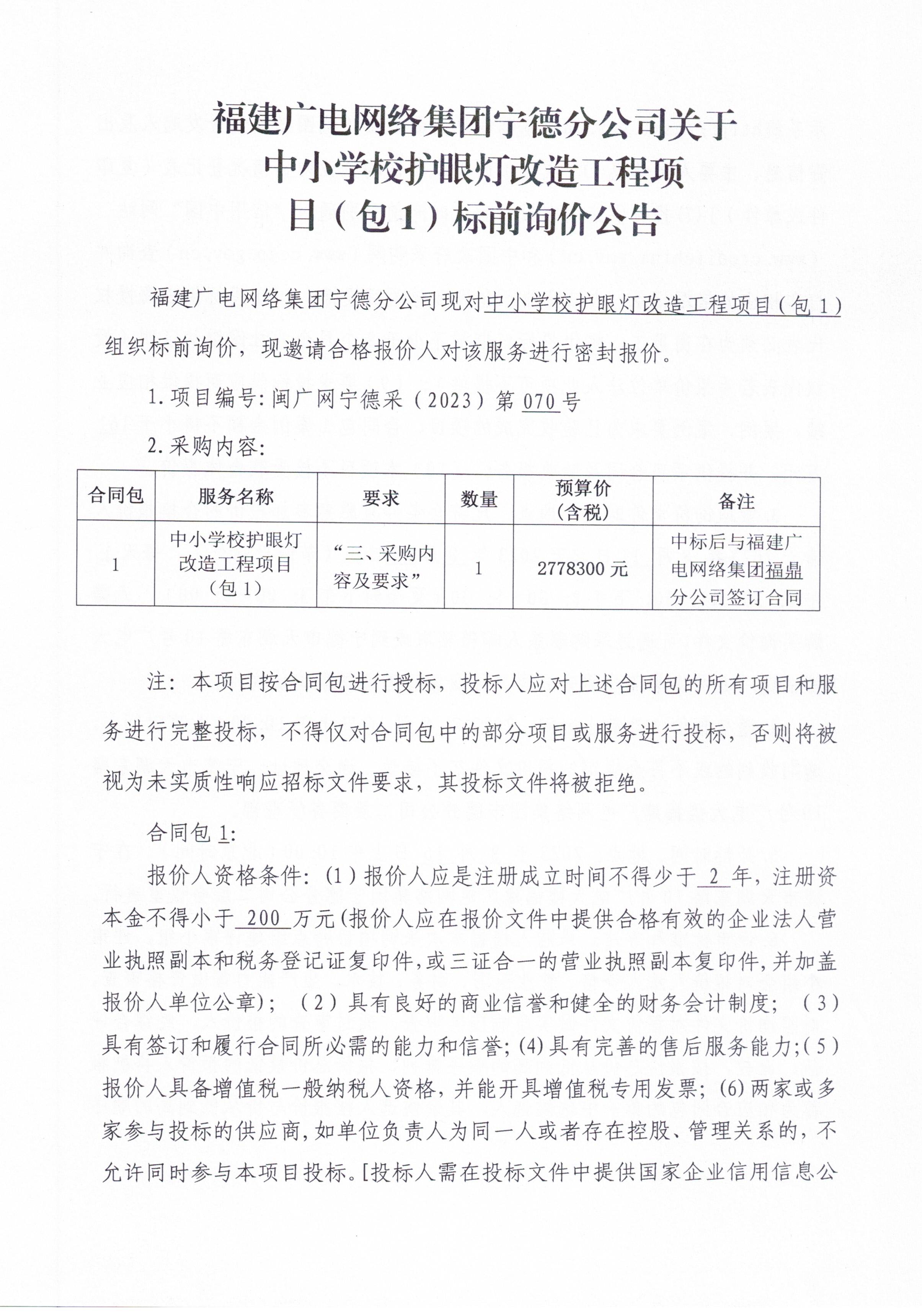 福建广电网络集团股份有限公司宁德分公司关于福鼎中小学校护眼灯改造工程项目(包1)标前询价公告
