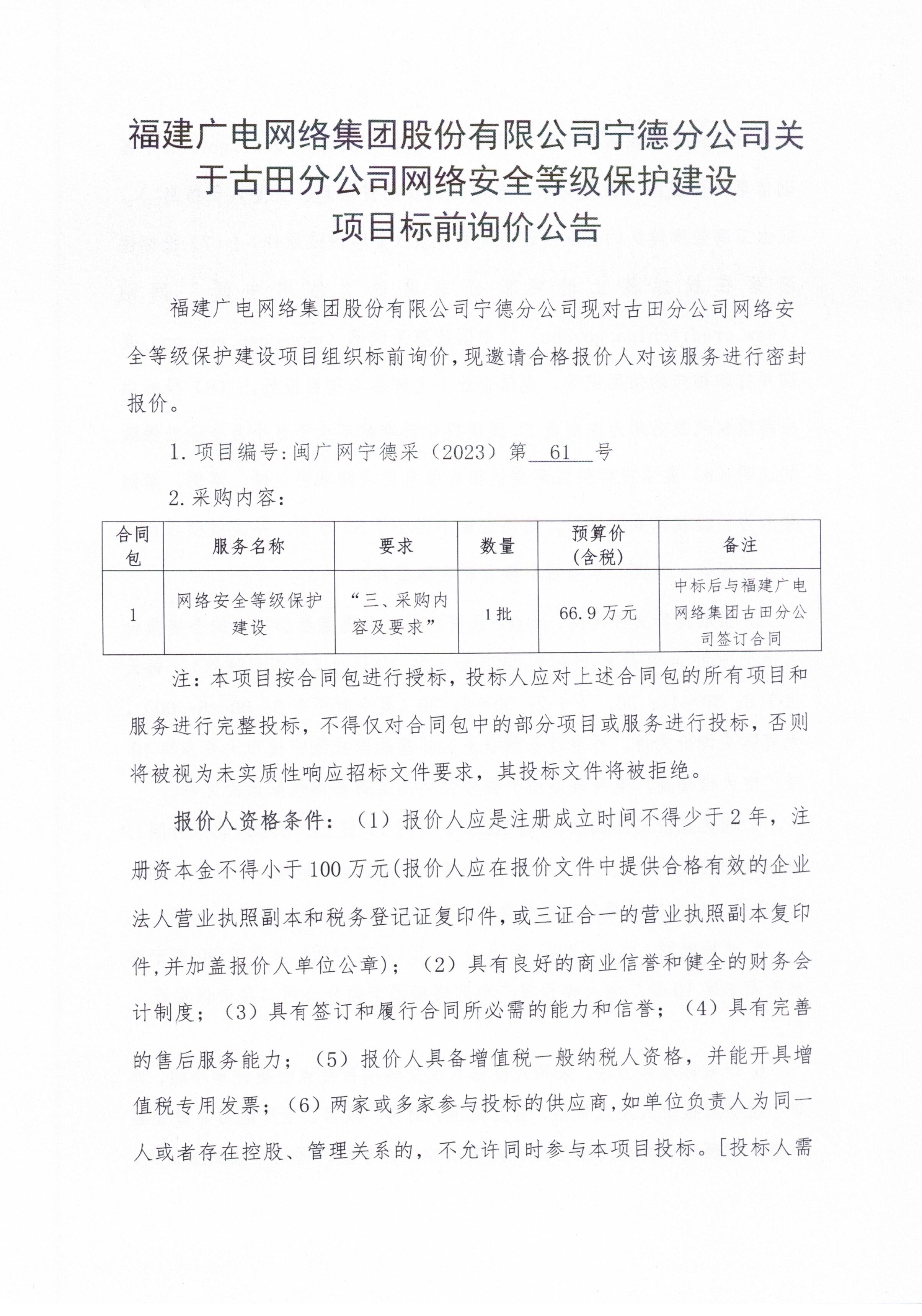 福建广电网络集团宁德分公司关于古田分公司网络安全等级保护建设项目标前询价公告