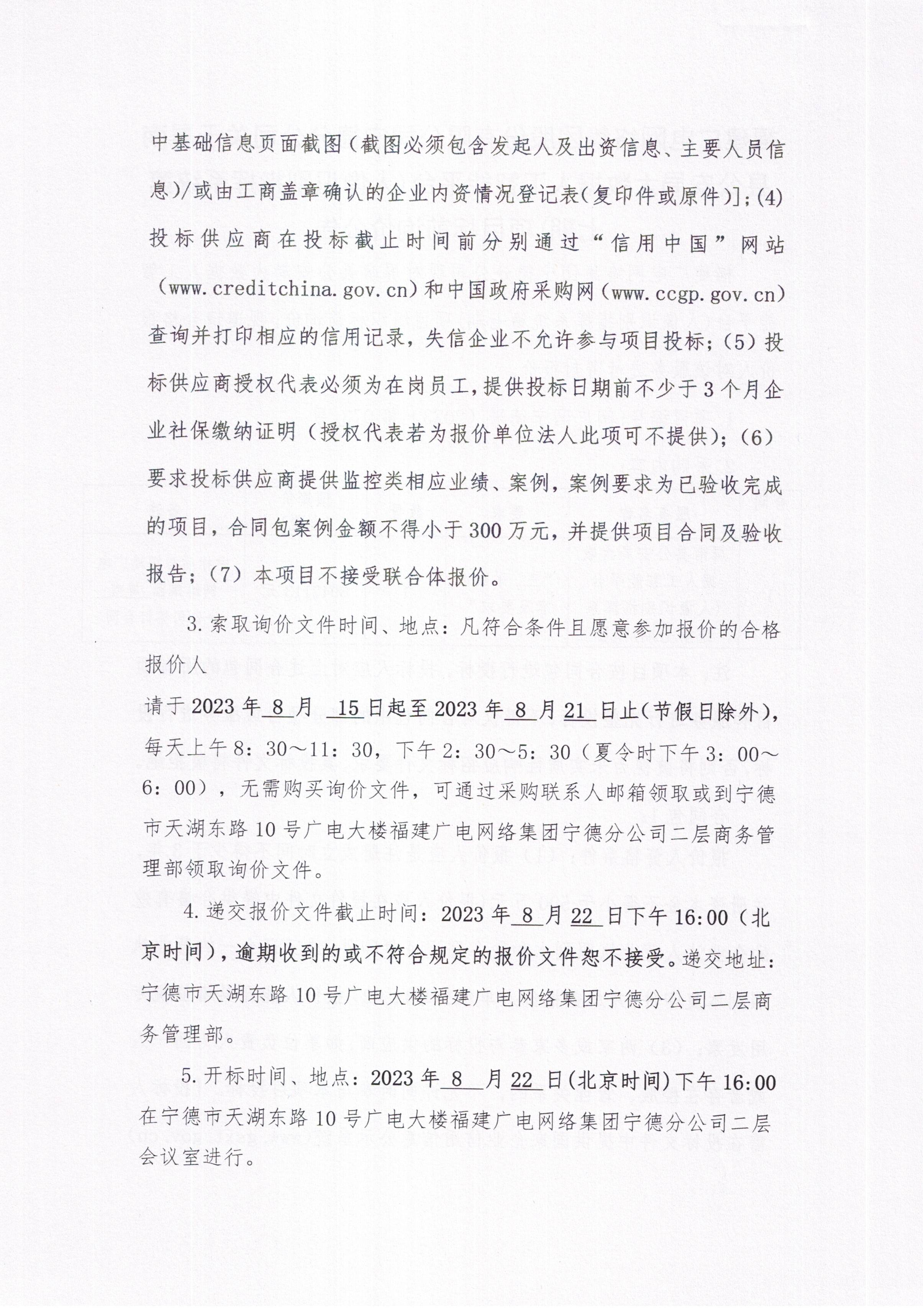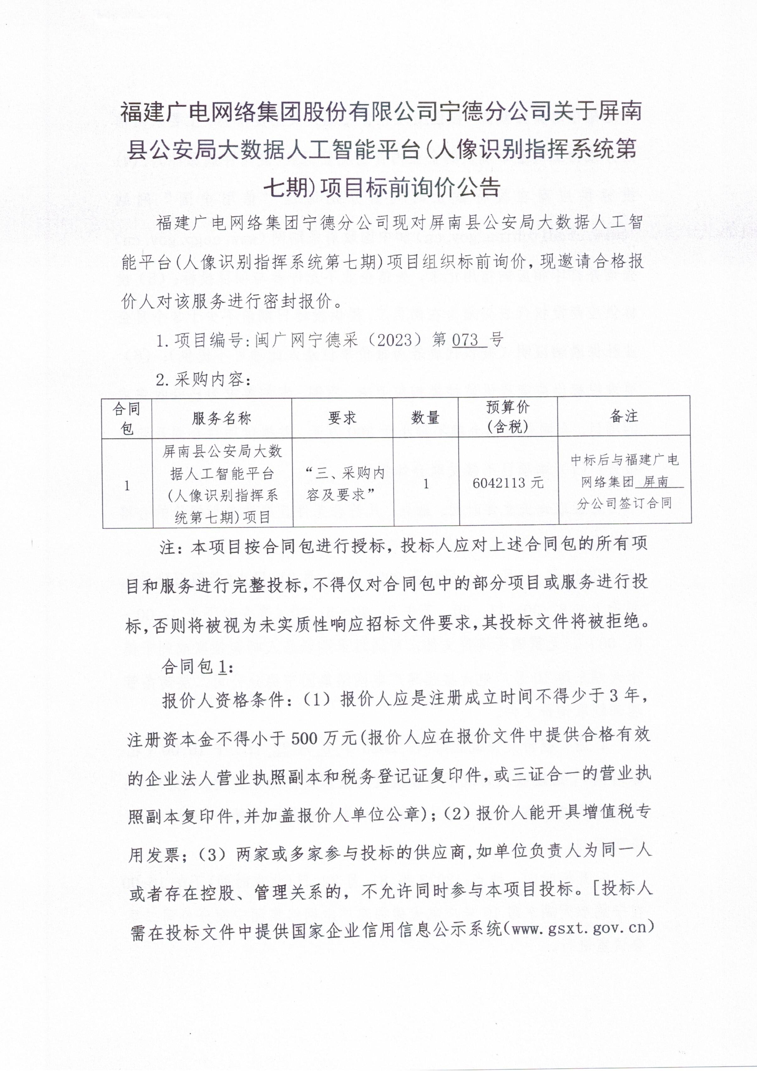 福建广电网络集团宁德分公司关于屏南县公安局大数据人工智能平台(人像识别指挥系统第七期)项目标前询价公告