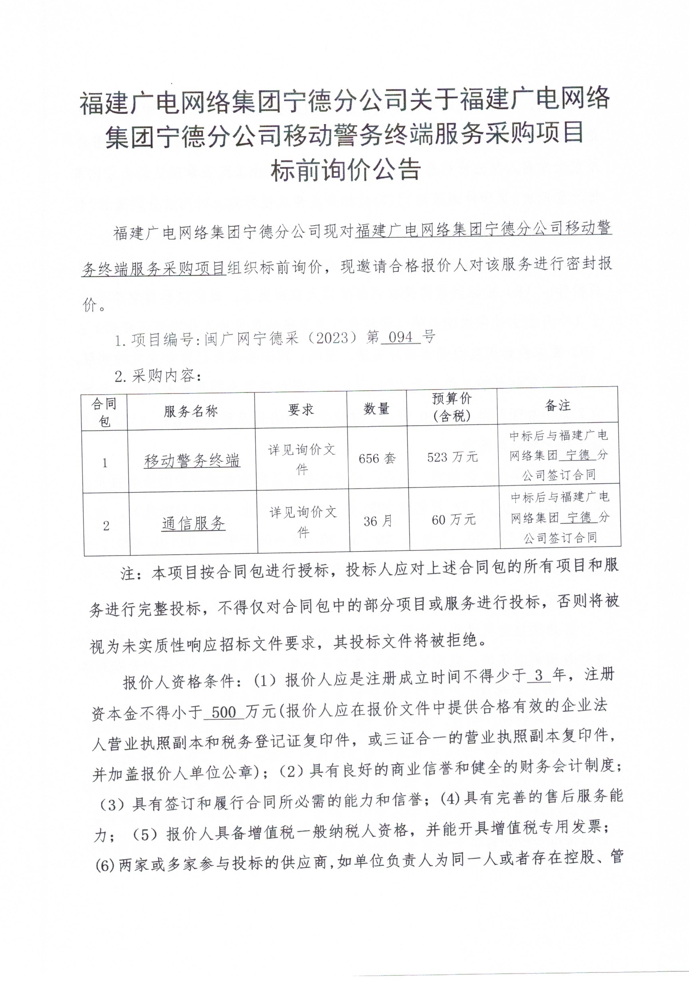 福建广电网络集团宁德分公司移动警务终端服务采购项目标前询价公告