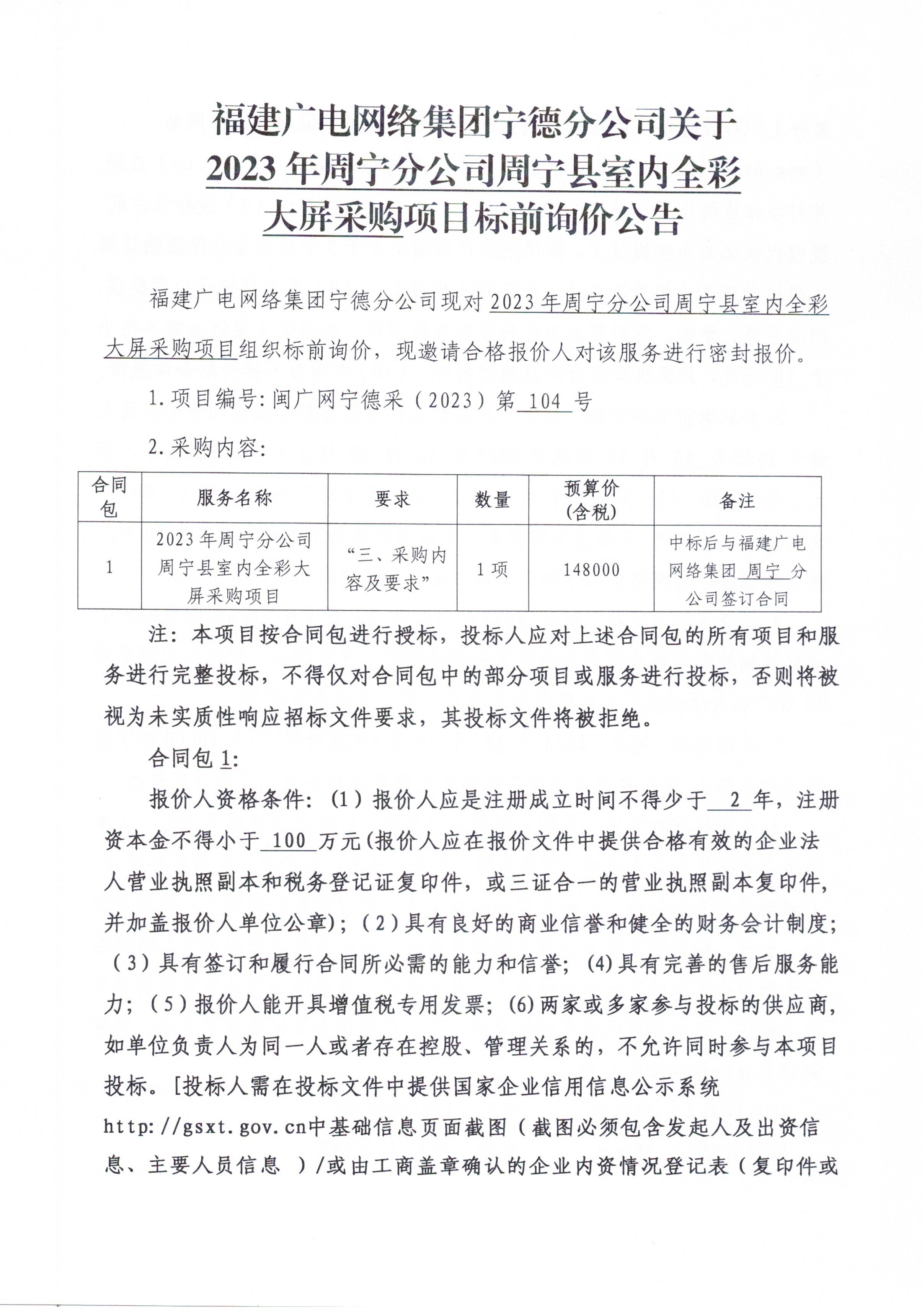 福建广电网络集团股份有限公司宁德分公司关于2023年周宁分公司室内全彩大屏采购项目