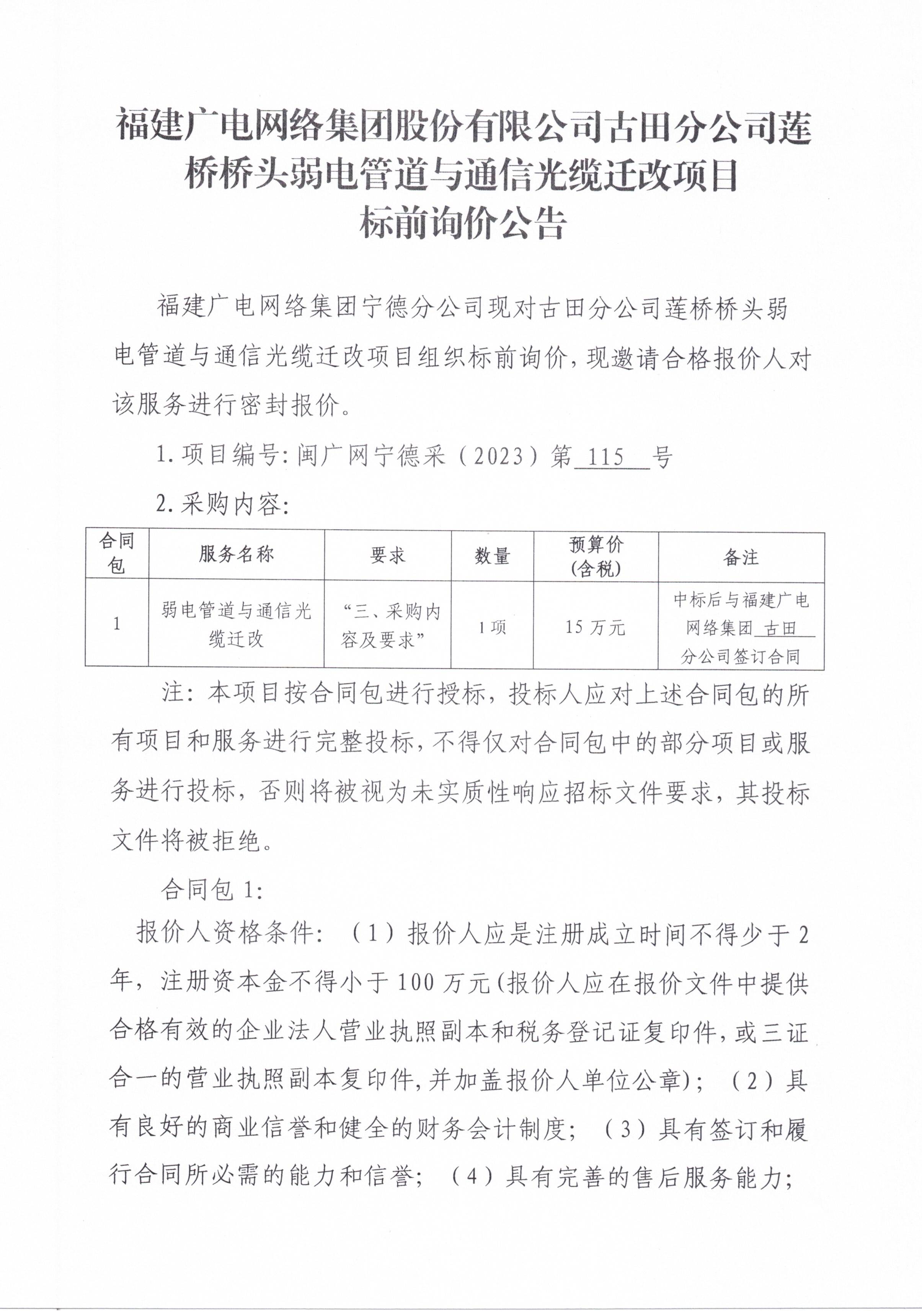 福建广电网络集团古田分公司莲桥桥头弱电管道与通信光缆迁改项目标前询价公告
