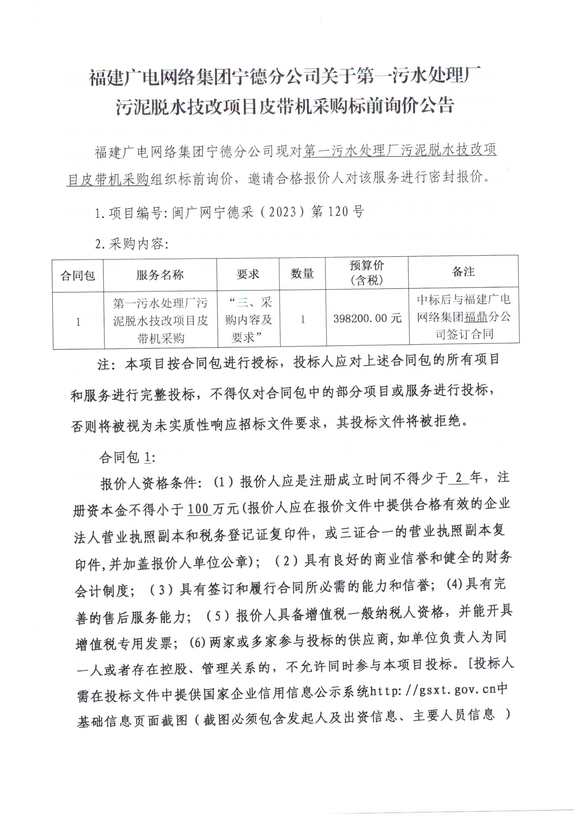 福建广电网络集团宁德分公司关于第一污水处理厂污泥脱水技改项目-皮带机采购标前询价公告