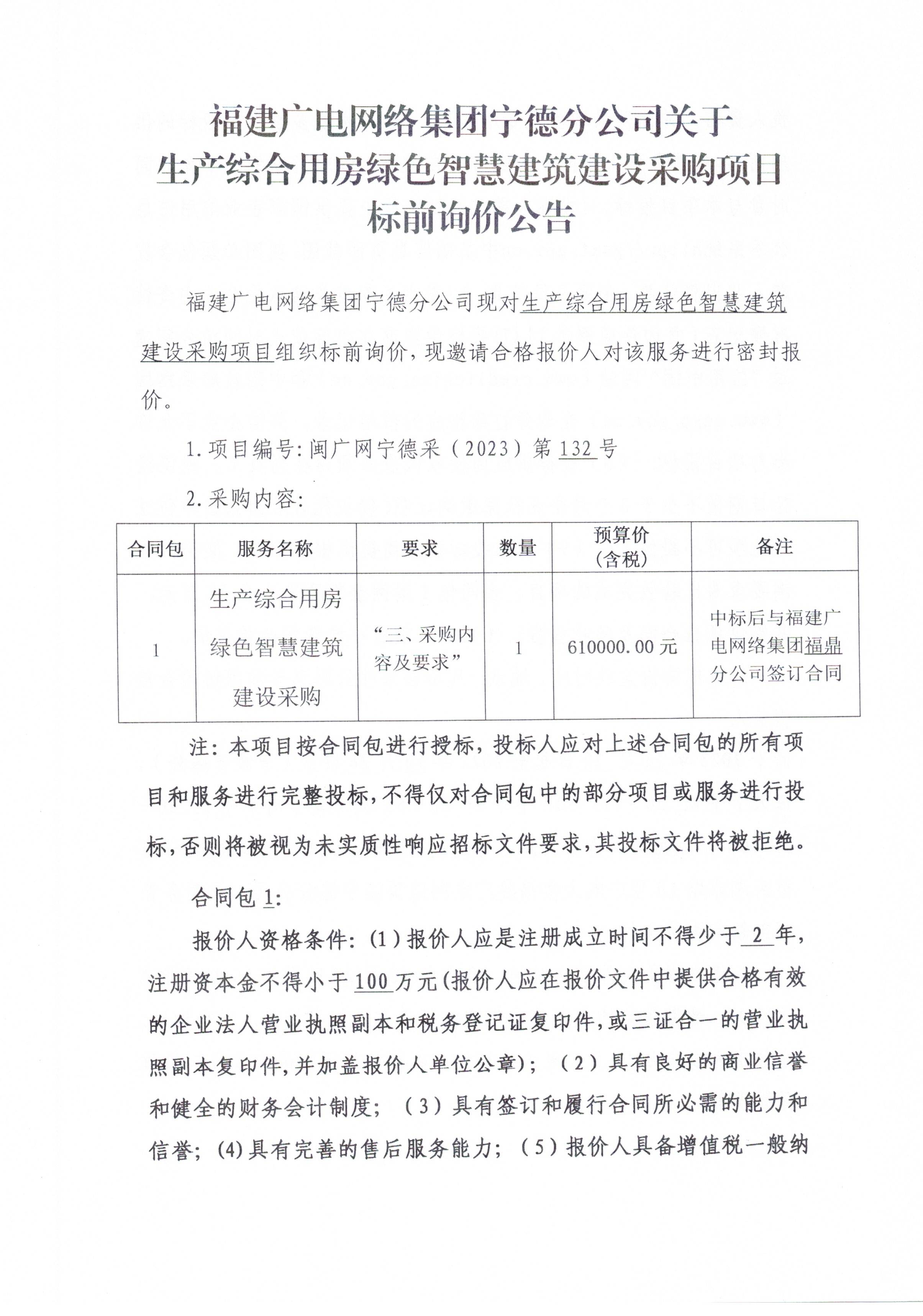 福建广电网络集团股份有限公司宁德分公司生产综合用房绿色智慧建筑建设采购项目标前询价公告