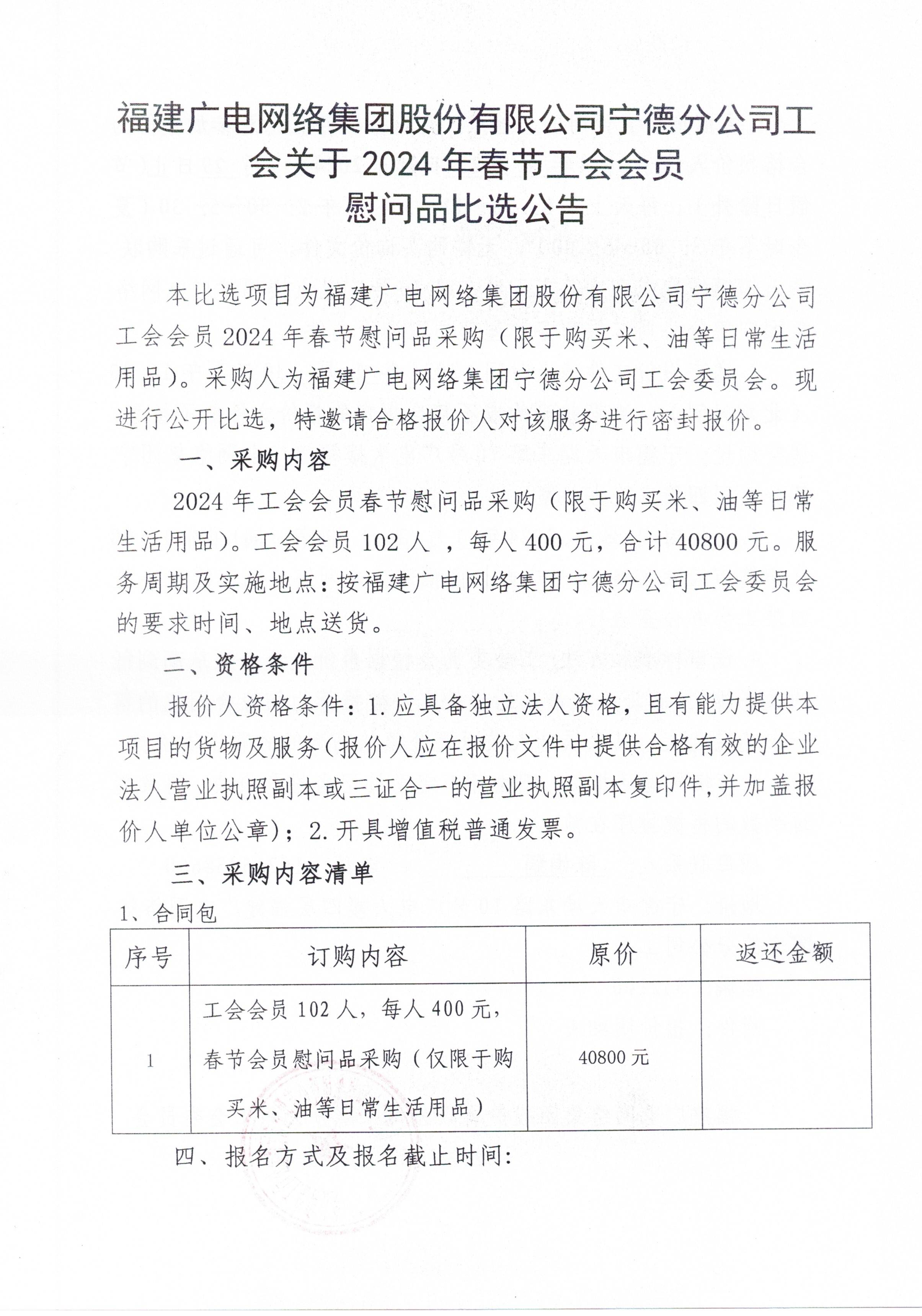 福建广电网络集团股份有限公司宁德分公司工会关于2024年春节会员节日慰问品比选公告