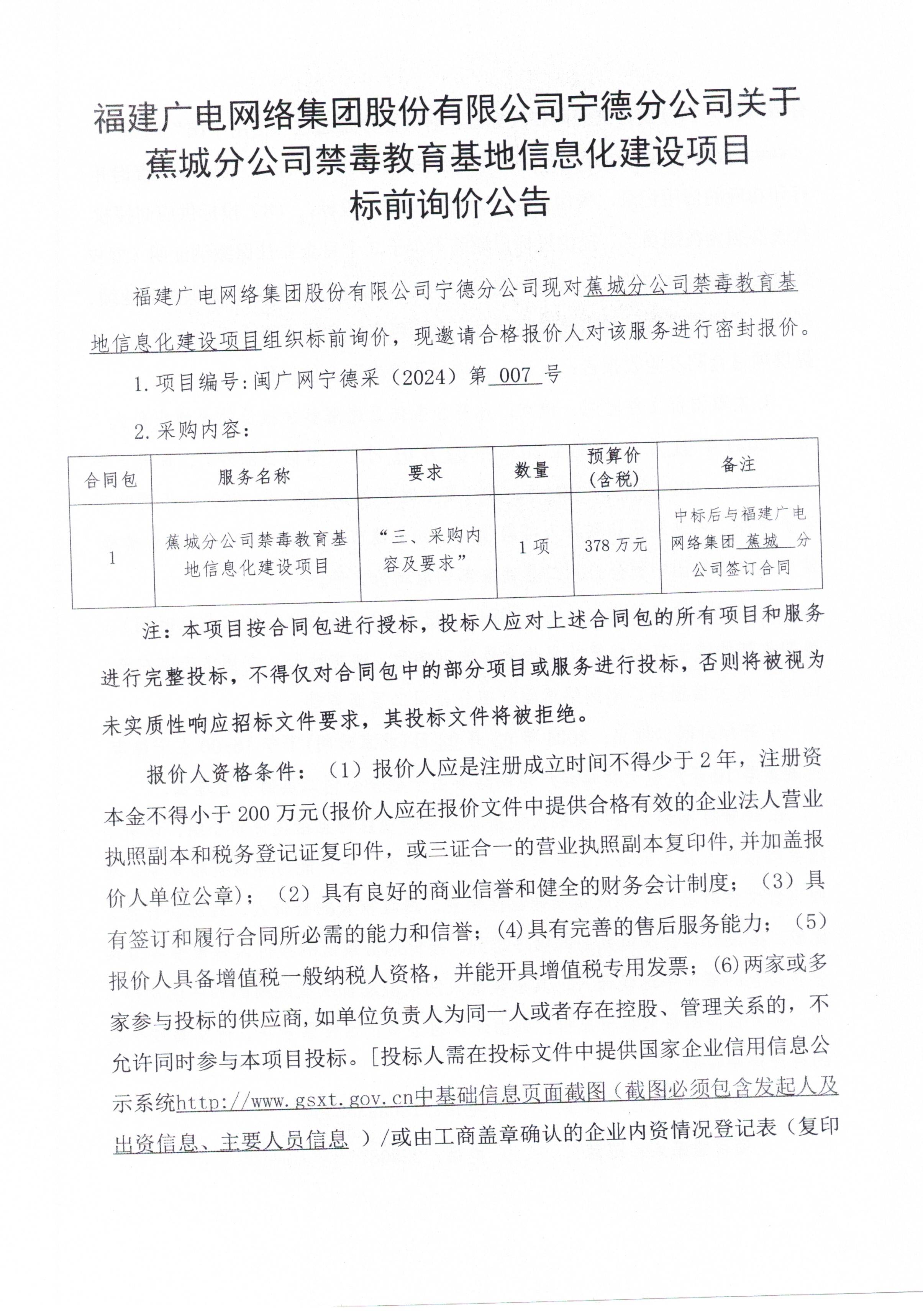 福建广电网络集团宁德分公司关于蕉城分公司禁毒教育基地信息化建设项目标前询价公告