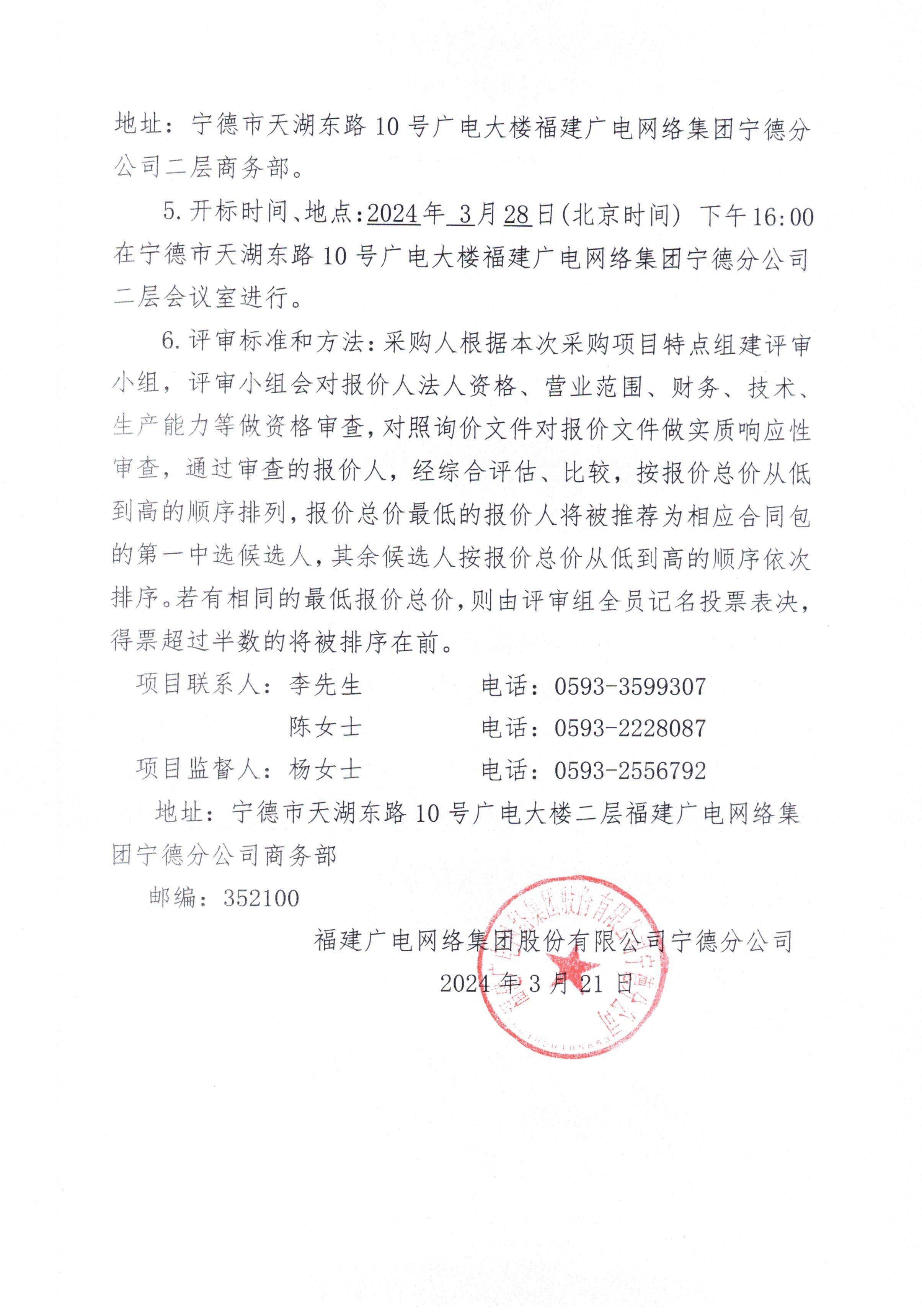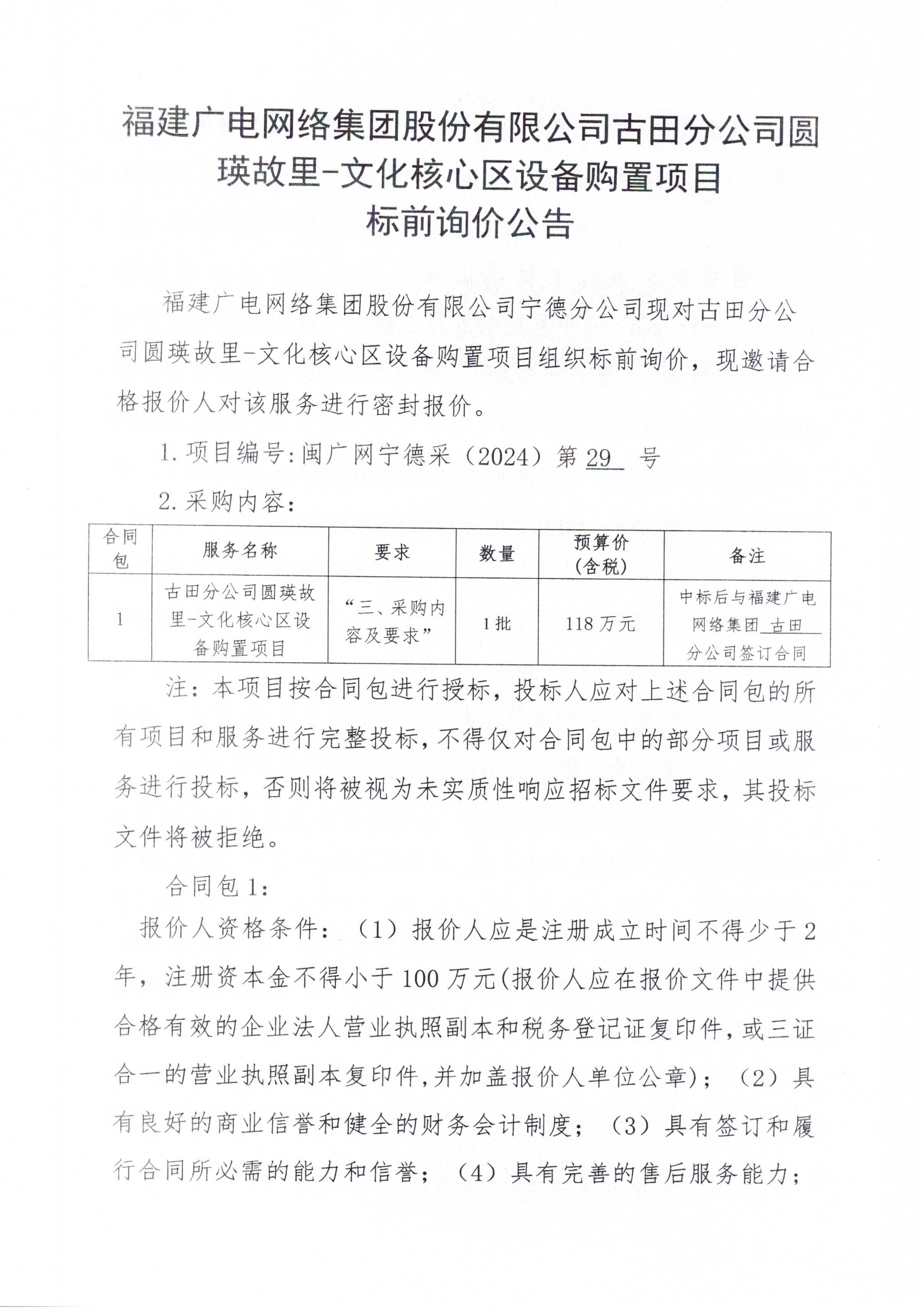 福建广电网络集团古田分公司圆瑛故里-文化核心区设备购置项目标前询价公告