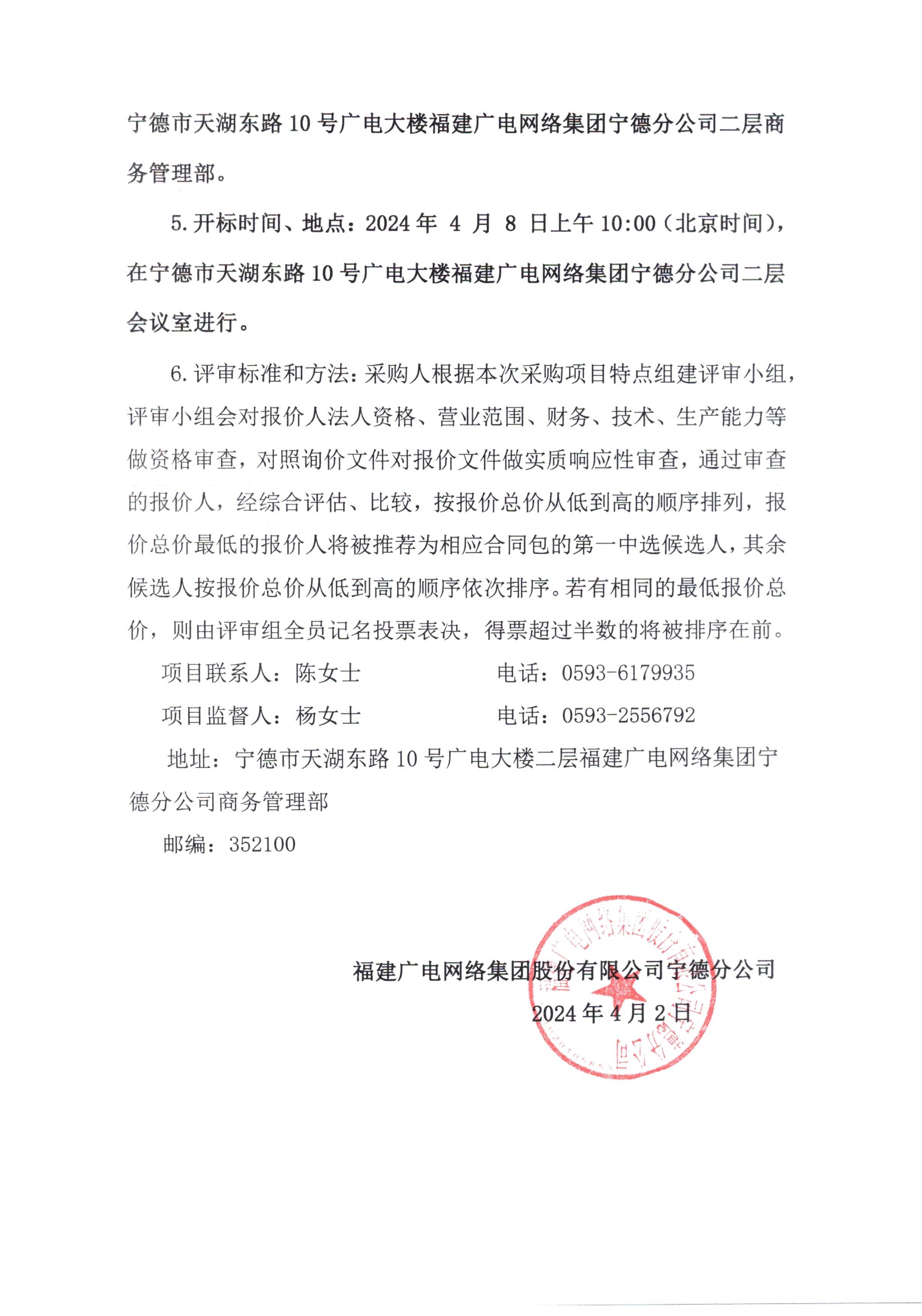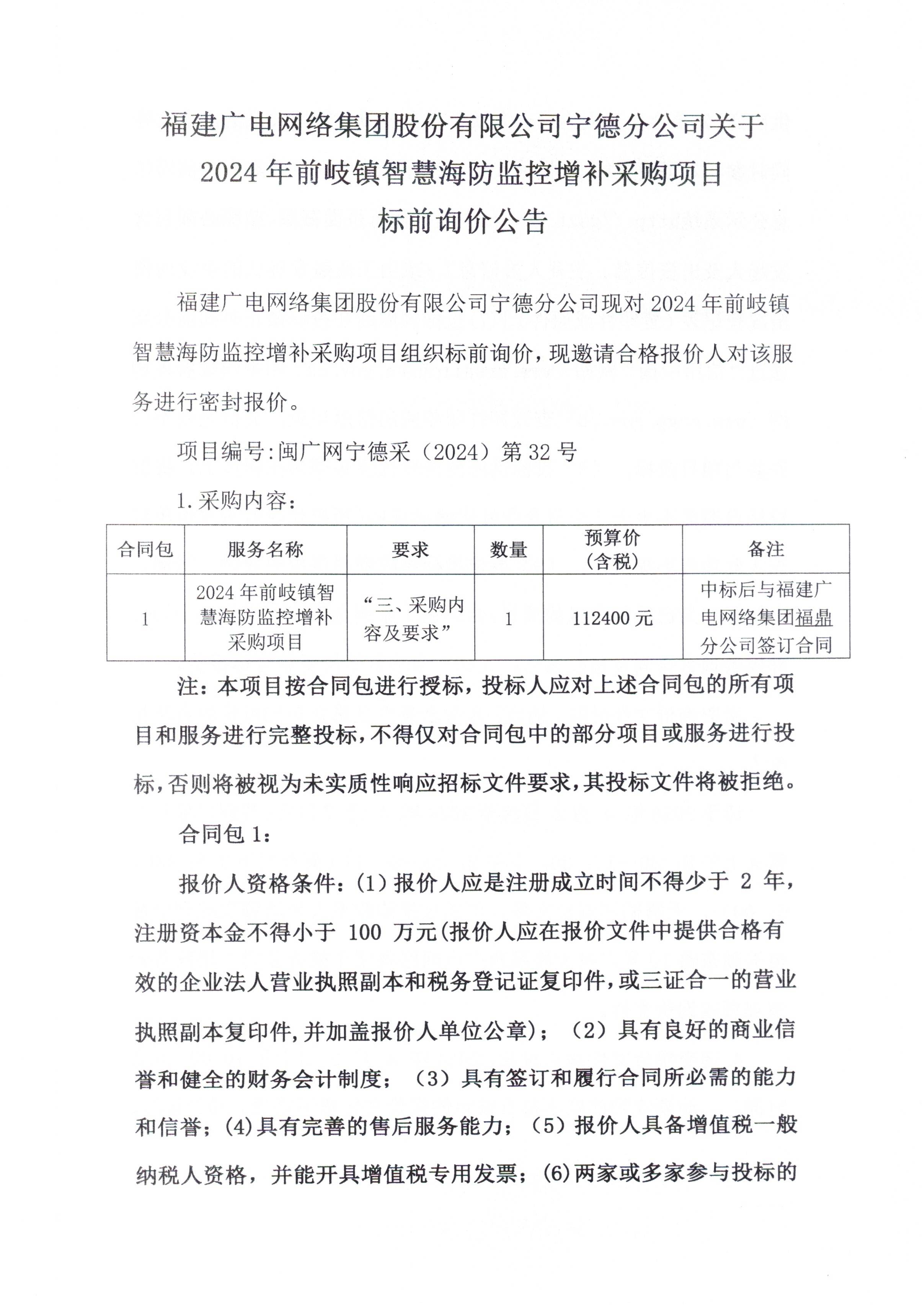 福建广电网络集团股份有限公司宁德分公司关于2024年前岐镇智慧海防监控增补采购项目标前询价公告