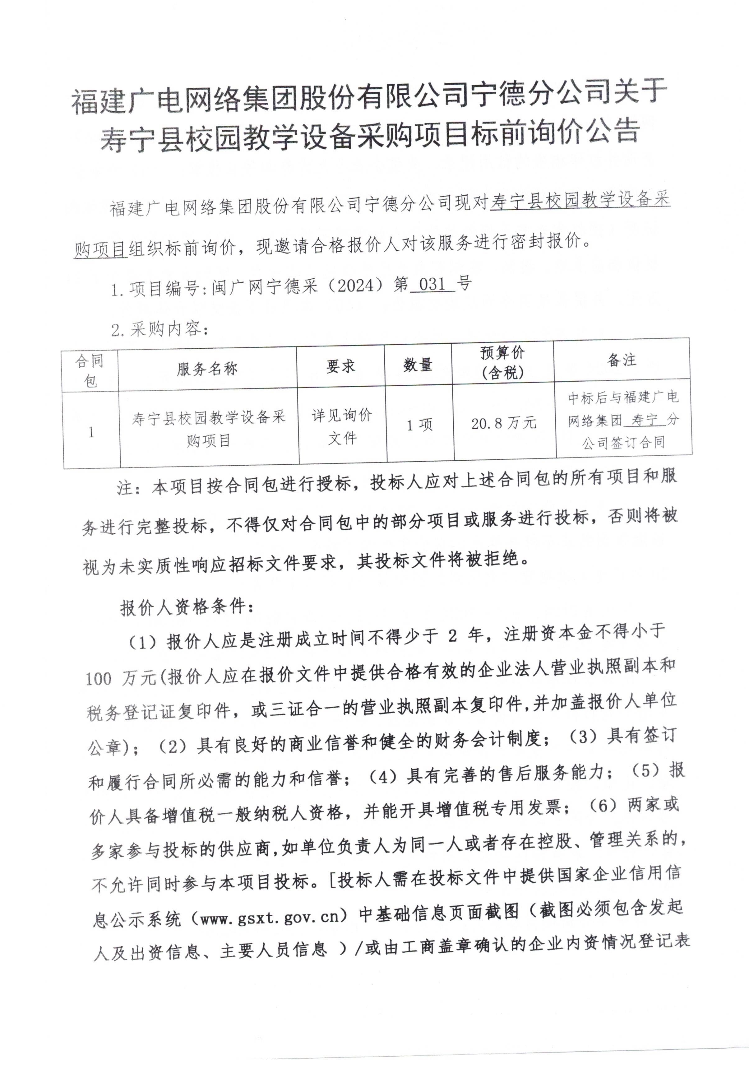 福建广电网络集团股份有限公司宁德分公司关于寿宁县校园教学设备采购项目标前询价公告