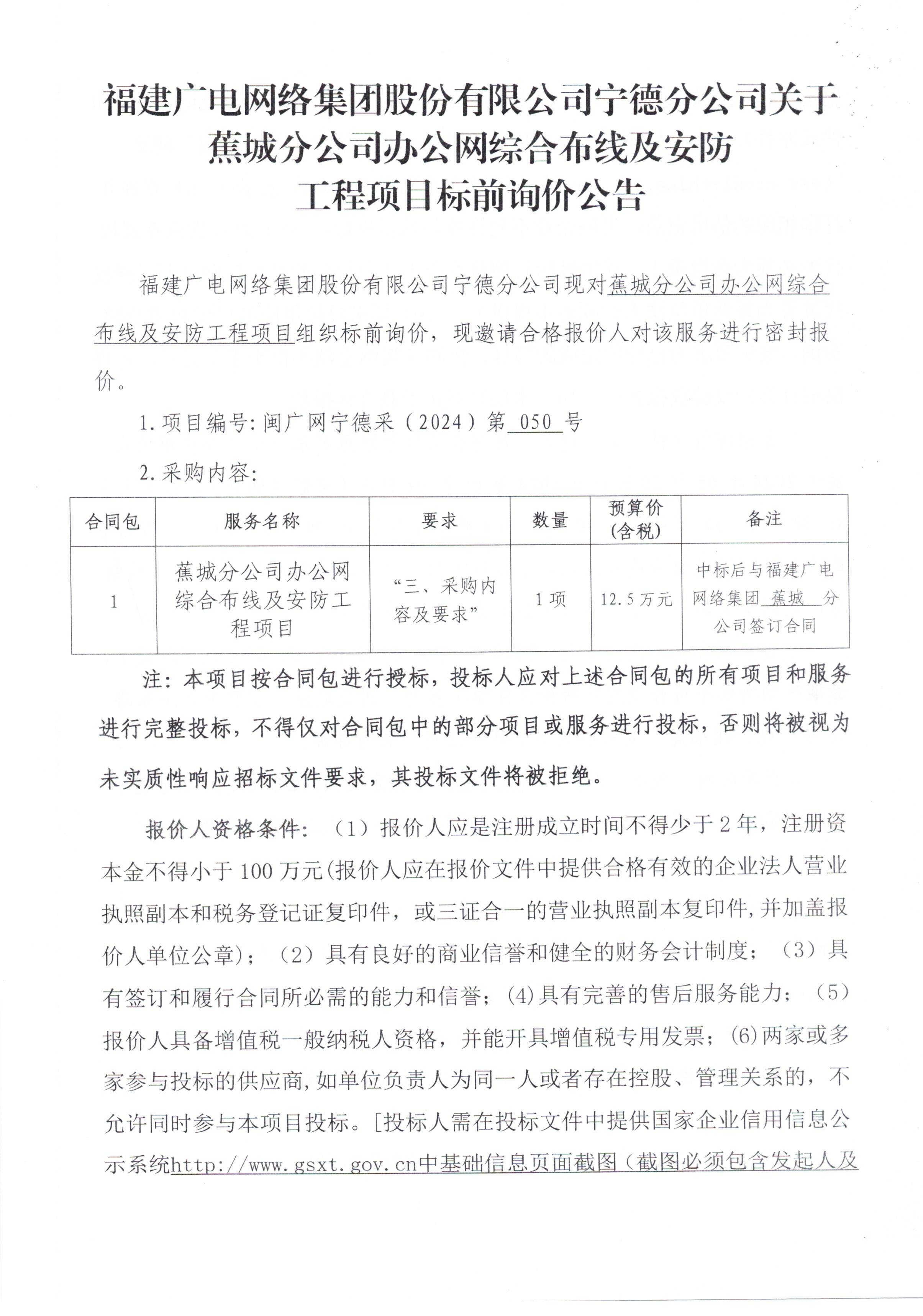 福建广电网络集团股份有限公司宁德分公司关于蕉城分公司办公网综合布线及安防工程项目