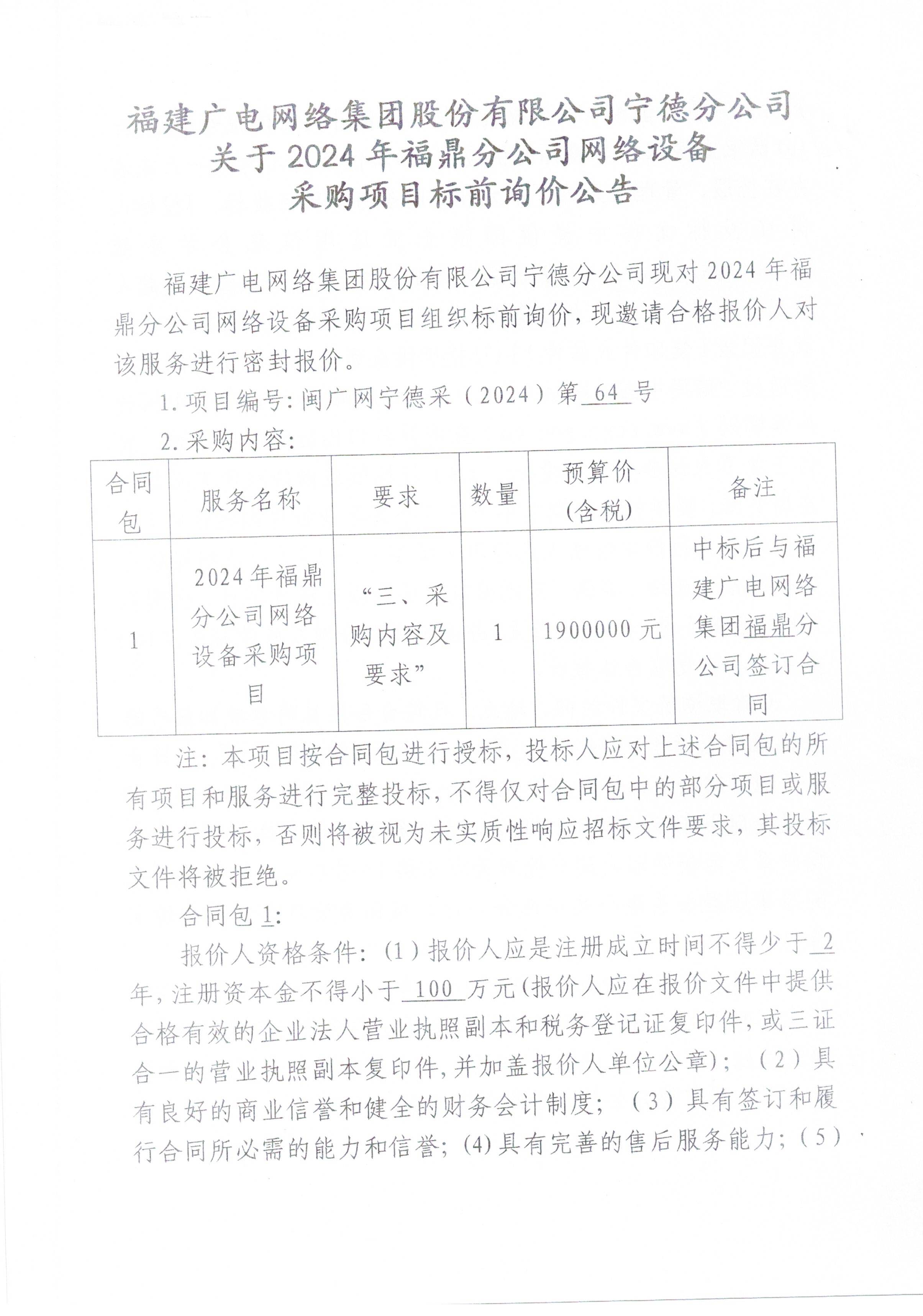 福建广电网络集团股份有限公司宁德分公司2024年福鼎分公司网络设备采购项目公告