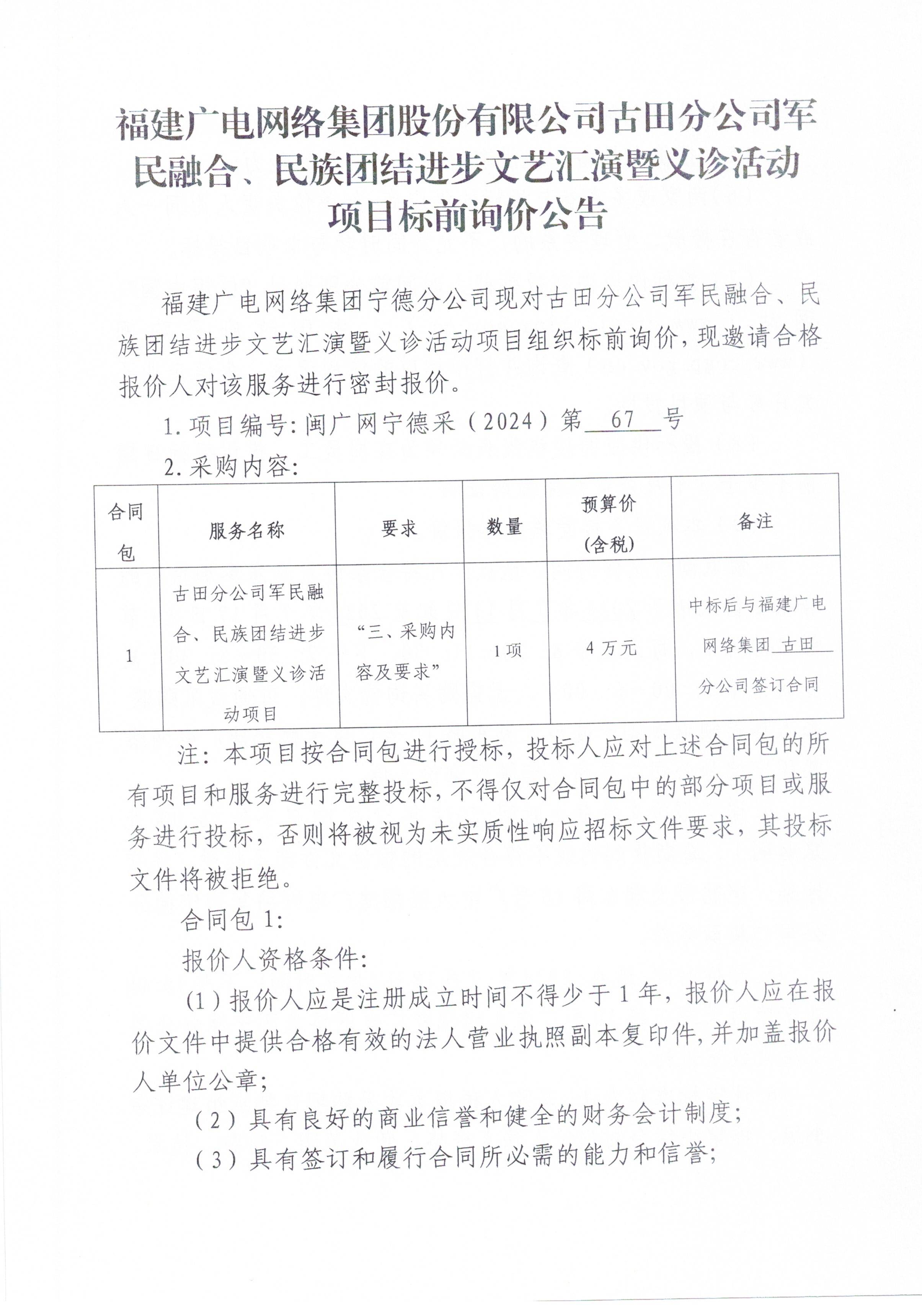 福建广电网络集团股份有限公司古田分公司军民融合、民族团结进步文艺汇演暨义诊活动项目