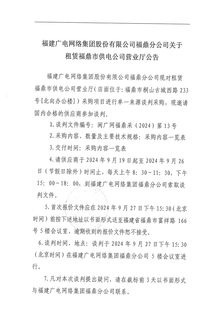 福建广电网络集团股份有限公司福鼎分公司关于租赁福鼎市供电公司营业厅采购项目