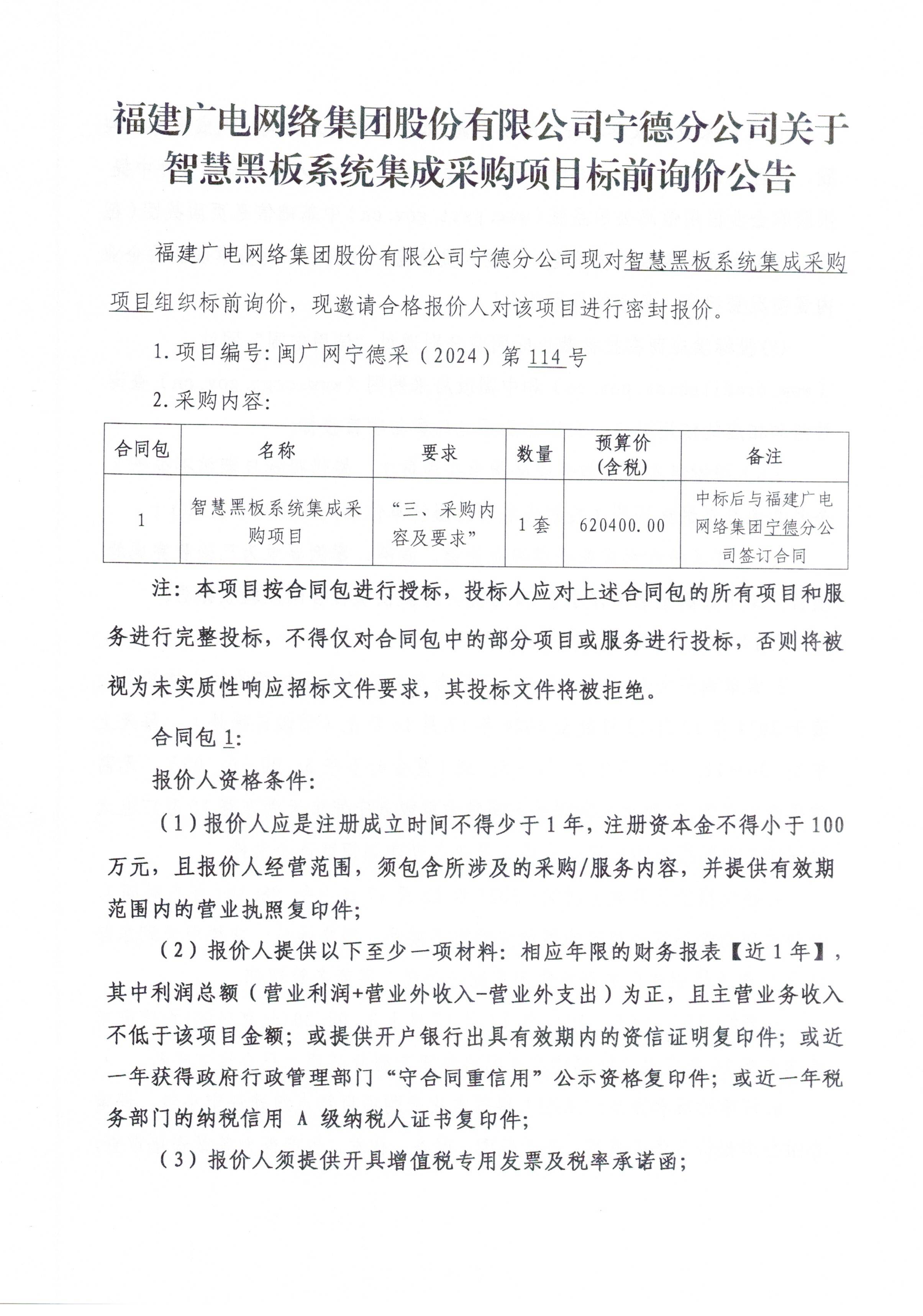 福建广电网络集团股份有限公司关于智慧黑板系统集成采购项目