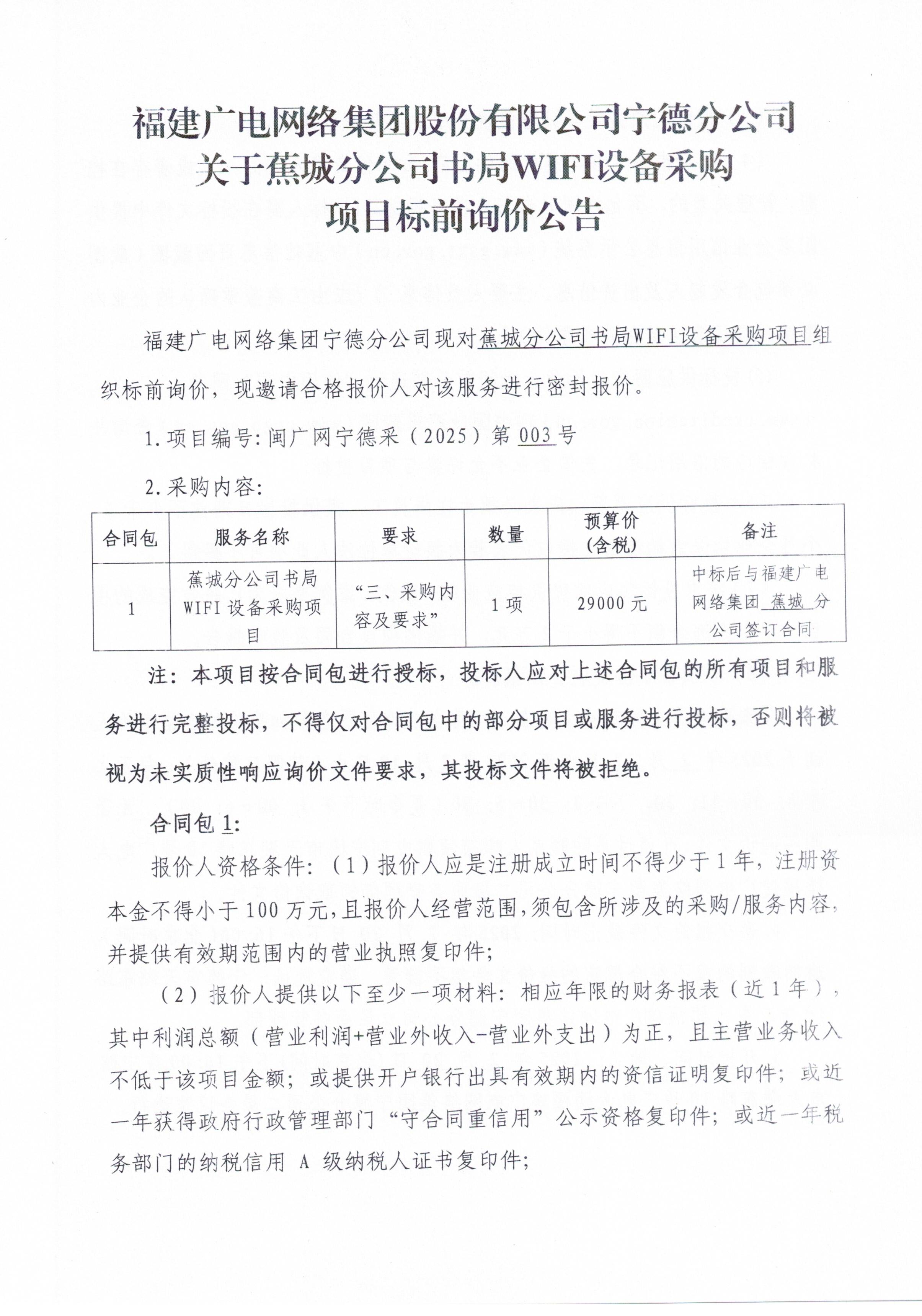 蕉城分公司书局WIFI设备采购项目(标前询价)
