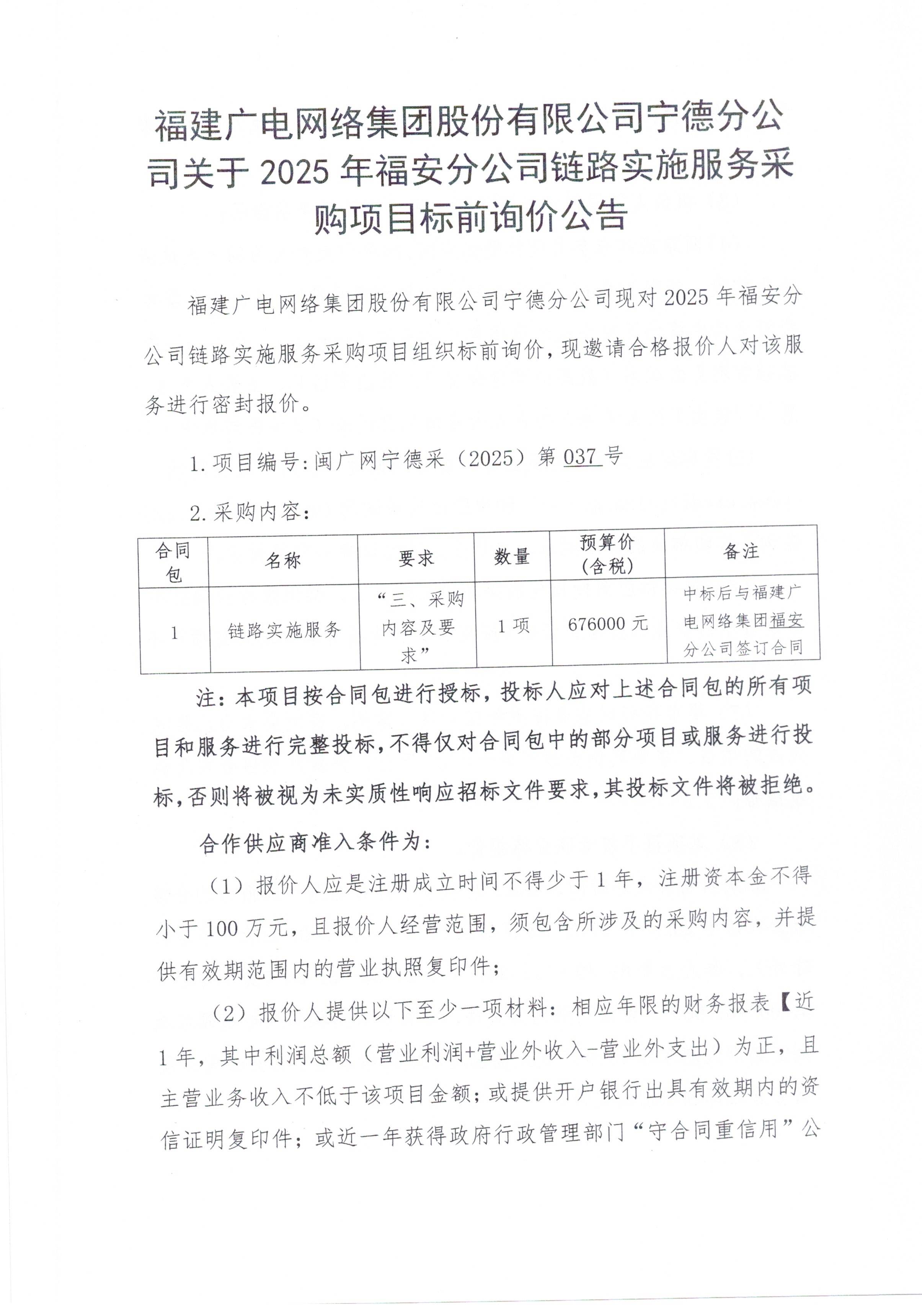 福建广电网络集团股份有限公司宁德分公司关于2025年福安分公司链路实施服务采购项目